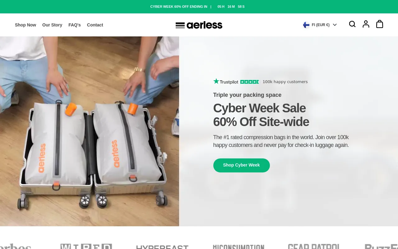 Triple your packing space when traveling with the NEW Aerless Vacuum Kit. The kit includes: ✔ Modular vacuum compression bags ✔ Portable & rechargeable air pump ✅ Waterproof, anti-rip vacuum bags ✅ Carry-on sized to fit in any travel bag ✅ Odor-proof packing ✅ USB-C rechargeable air pump: 20 uses on full charge ✅ 1-year warranty Save 60% packing space and travel smarter. Get your kit today, 60% OFF SITE-WIDE.