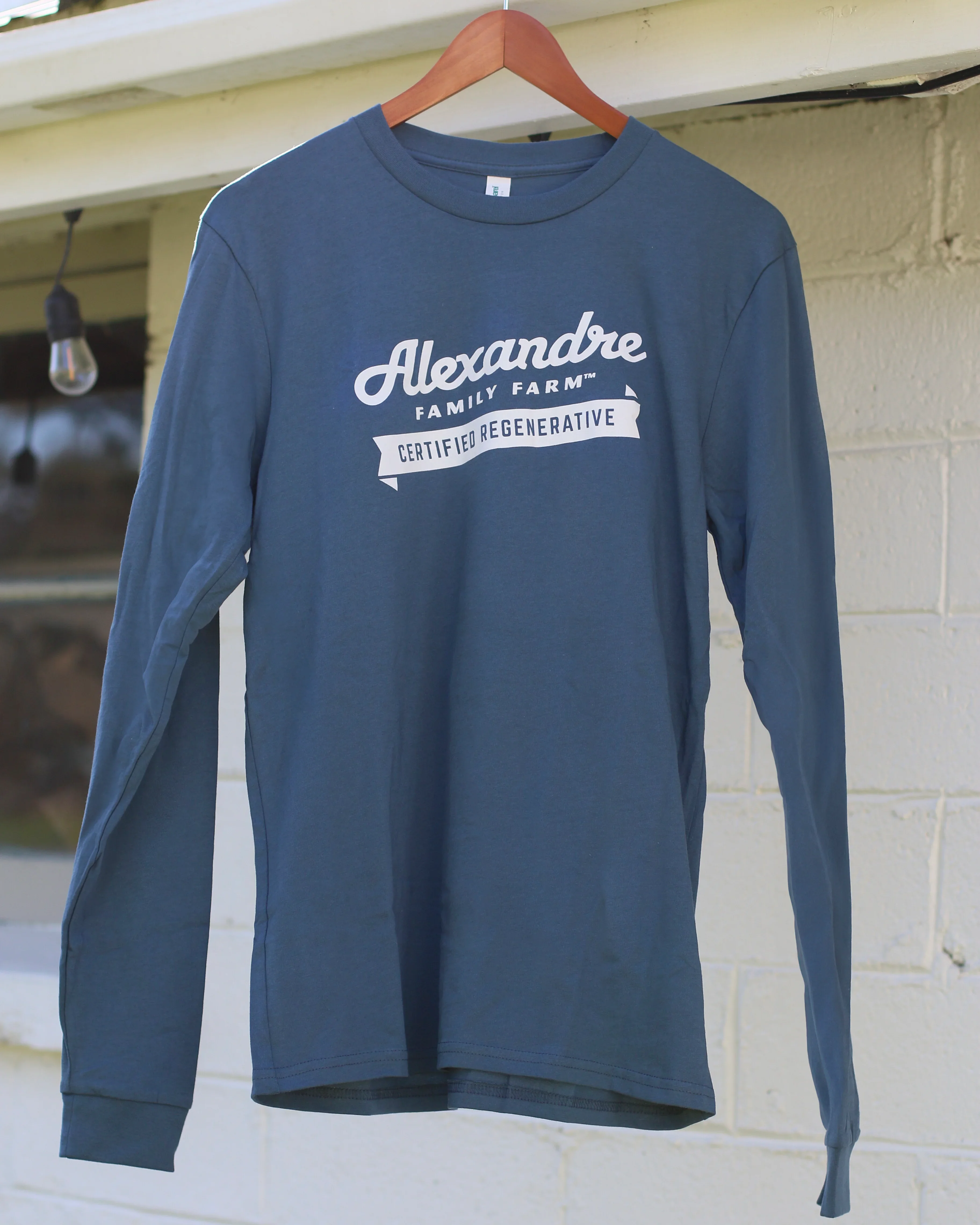 Proudly display your support for certified regenerative dairy with our logo banner long-sleeve shirt. FRONT DESIGN: AFF Logo with "Certified Regenerative" Banner BACK DESIGN: Round design with "Regenerative A2/A2 Organic Dairy" MATERIAL: 100% Combed Ring Spun Organic Cotton Also available in black and green