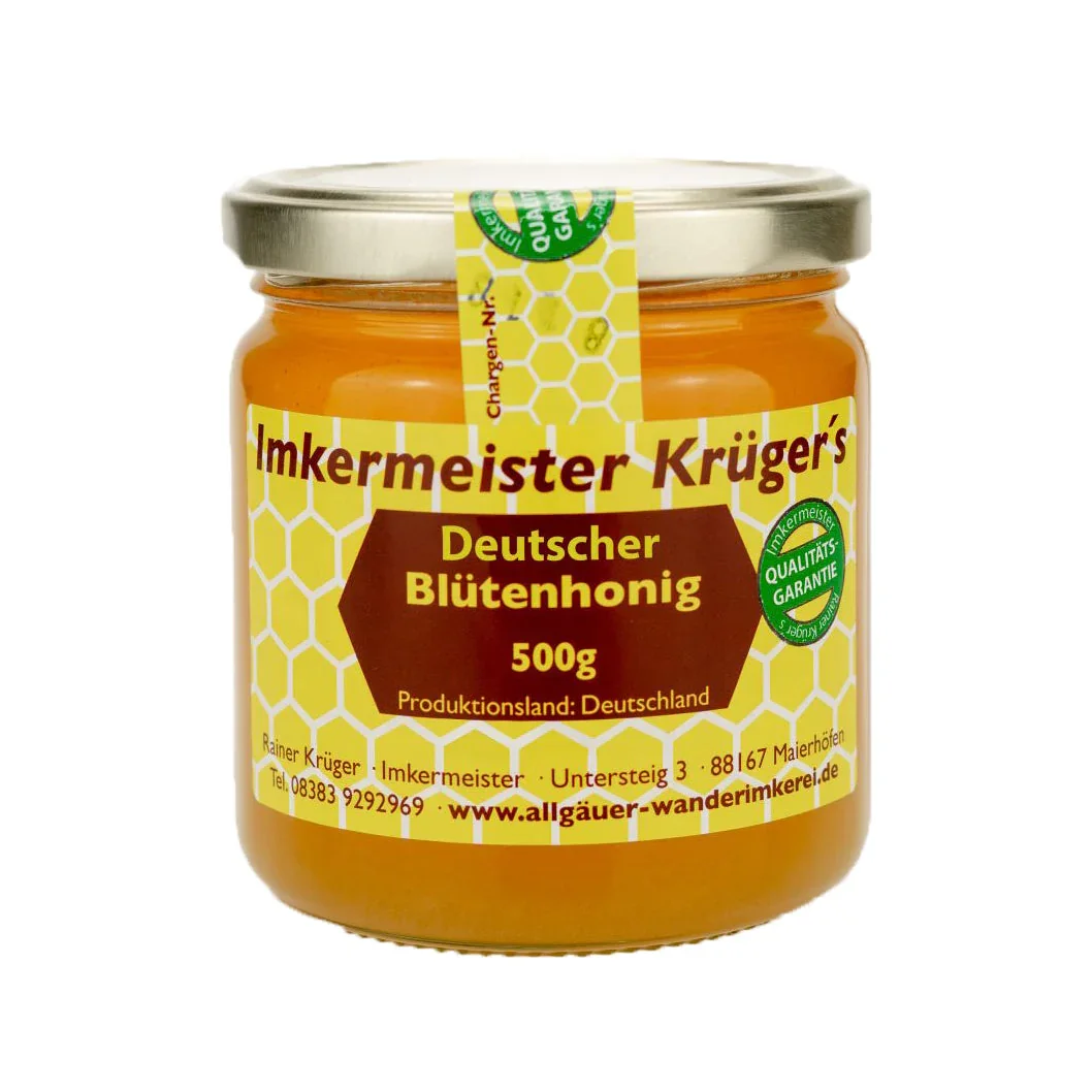 Deutscher Blütenhonig – 100% Imker Naturprodukt Wir möchten Dir das Wohlgefühl eines warmen Sommertages vermitteln, wenn Du unseren deutschen Blütenhonig genießt. Der Duft der Sommertracht spiegelt sich im Geschmack wider und süßt Deine Lieblingsspeisen und Getränke auf natürliche Weise. Deutscher Blütenhonig – ein Geschmackserlebnis Dieser Blütenhonig hat eine außergewöhnliche, fein aromatische Geschmacksnote. Dieser Honig wird zwischen Juni und August geerntet, wodurch er die volle Aromenvielfalt der deutschen Sommerblüten erhält. Wenn die Bienen die Sommertracht ernten und verarbeiten, werden am Bienenstock über den Tag verteilt verschiedenste Aromen durch die Herstellung von deutscher Blütenhonig freigesetzt. Diese entfalten sich bis zum Abend vollends und machen einen Abend am Bienenstock zu einem ganz besonderen Erlebnis . Die Geschmacksvarianten dieses Honigs kommen vom Nektar, den die Pflanze liefert. Diesem gibt sie auch große Mengen an pflanzentypischen Aromen zu. Die unterschiedlichen Geschmacksvarianten von Blütenhonig sind je nach Pflanzenart sehr individuell. Dieser Umstand macht unseren deutschen Blütenhonig so einzigartig. Der besondere Deutsche Blütenhonig wird von uns direkt in Deutschland gewonnen sowie aus regionalen und naturbelassenen Standorten unserer Partner-Imkereien in Deutschland. Produktdetails: Produktionsland : Deutschland Verwendung: Deutscher Blütenhonig ist vielseitig einsetzbar und überzeugt durch seinen milden, blumigen Geschmack. Perfekt zum Süßen von Tees und Getränken, als Brotaufstrich oder in Joghurt und Müsli. Er verfeinert Dressings, Marinaden und Saucen und ist ideal für Backwaren, wo er eine natürliche Süße und reiches Aroma hinzufügt. Sehr beliebt bei unseren großen und kleinen Honigfans. Farbe, Konsistenz & Geschmack: Farbe : gelblich Konsistenz : flüssig Geschmack : feinaromatischer geschmackvoller Honig Zutaten: Honig ist ein reines von Bienen gesammeltes Naturprodukt ohne Zusätze jeglicher Art. Unser Deutscher Blütenhonig kommt im 500g-Glas. Lagerung, Tipps und Haltbarkeit: Lagerung : Für optimale Frische bei Raumtemperatur lagern. Tipps : Wenn Du deutschen Blütenhonig kaufst und ihn gerade nicht benötigst, stelle ihn in den Gefrierschrank (nicht den Kühlschrank), um ihn flüssig zu halten. Durch die Kälte wird die molekulare Bewegung so stark verlangsamt, dass sich keine Zuckerkristalle bilden können. Wenn Du zum Beispiel einen flüssigen Honig, der normalerweise nach 3 Wochen kristallisiert, in den Gefrierschrank stellst und nach einem Jahr wieder herausholst, bleibt er flüssig. Die Inhaltsstoffe und die Qualität bleiben dabei zu 100 % erhalten. Um kristallisierten Honig wieder flüssig zu machen, empfehlen wir Dir, den Honig in ein etwa 40 Grad warmes Wasserbad zu stellen. Nach ein paar Minuten hat Dein Honig wieder seine ursprüngliche Konsistenz zurückerlangt. Den deutschen Blütenhonig gibt es auch in cremiger Konsistenz: Deutscher Blütenhonig cremig . Haltbarkeit : ca. 2 Jahre haltbar Qualitätsgarantie: Naturbelassene Standorte Pestizidfreie Produkte Roher Honig vom Imker (gemäß Honigverordnung) Laborgeprüfte Qualität Laboranalysen: Laboranalyse Echtheit NMR Deutscher Blütenhonig Laboranalyse Echtheit 850 Deutscher Blütenhonig Laboranalyse Pestizidfrei Deutscher Blütenhonig