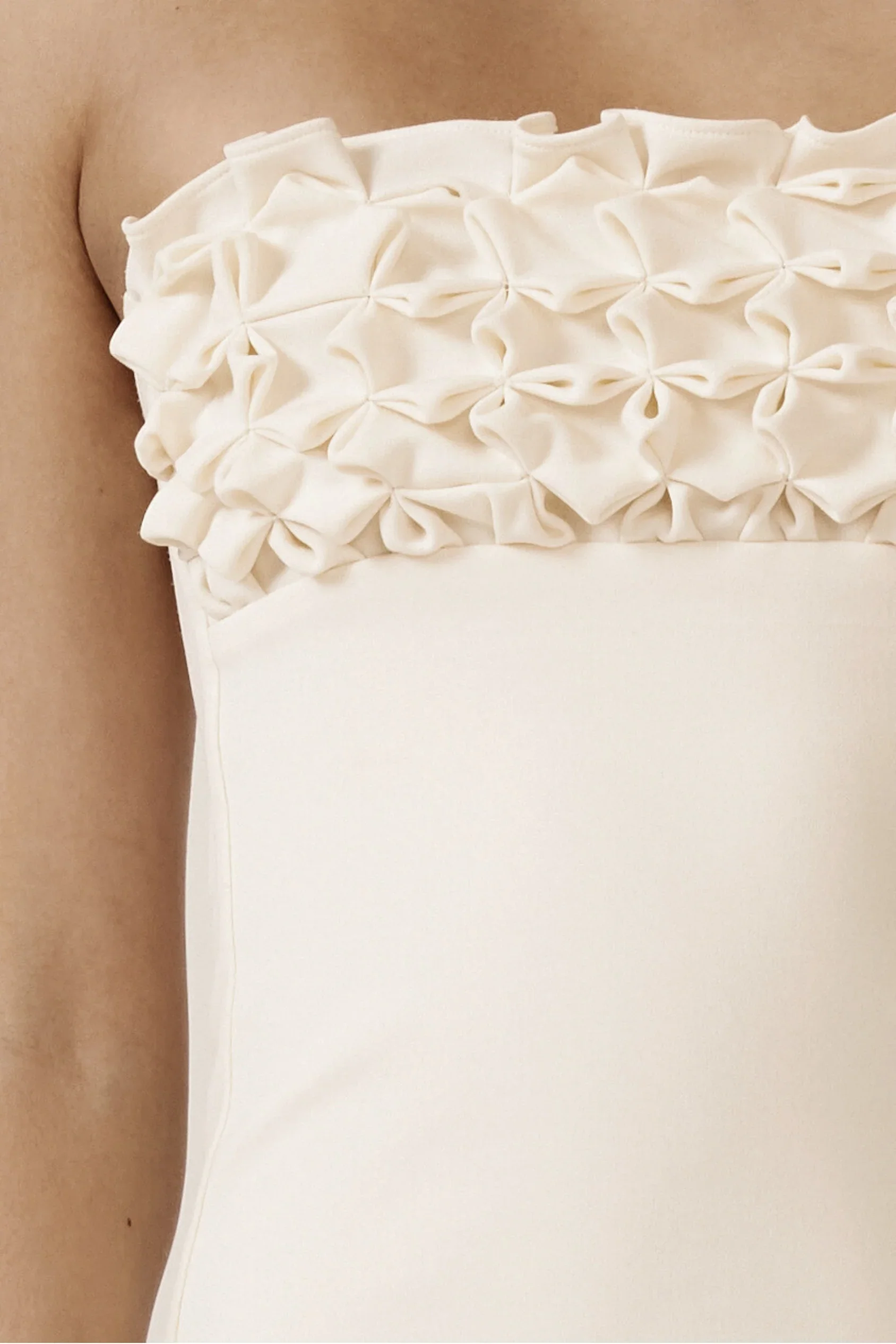 Meet the Jude Top in Cream. A bandeau silhouette with handcrafted floral smocking for a romantic, textural finish. Featuring a side zipper, it cinches the bodice for a flattering fit. Pair with the Jude Skirt for a polished, cohesive look. Pairs perfectly with the J ude Mini Skirt and Jude Maxi Skirt. * This smock is a delicate, handcrafted design and should be handled with care. Please do not machine wash — we recommend dry clean only.