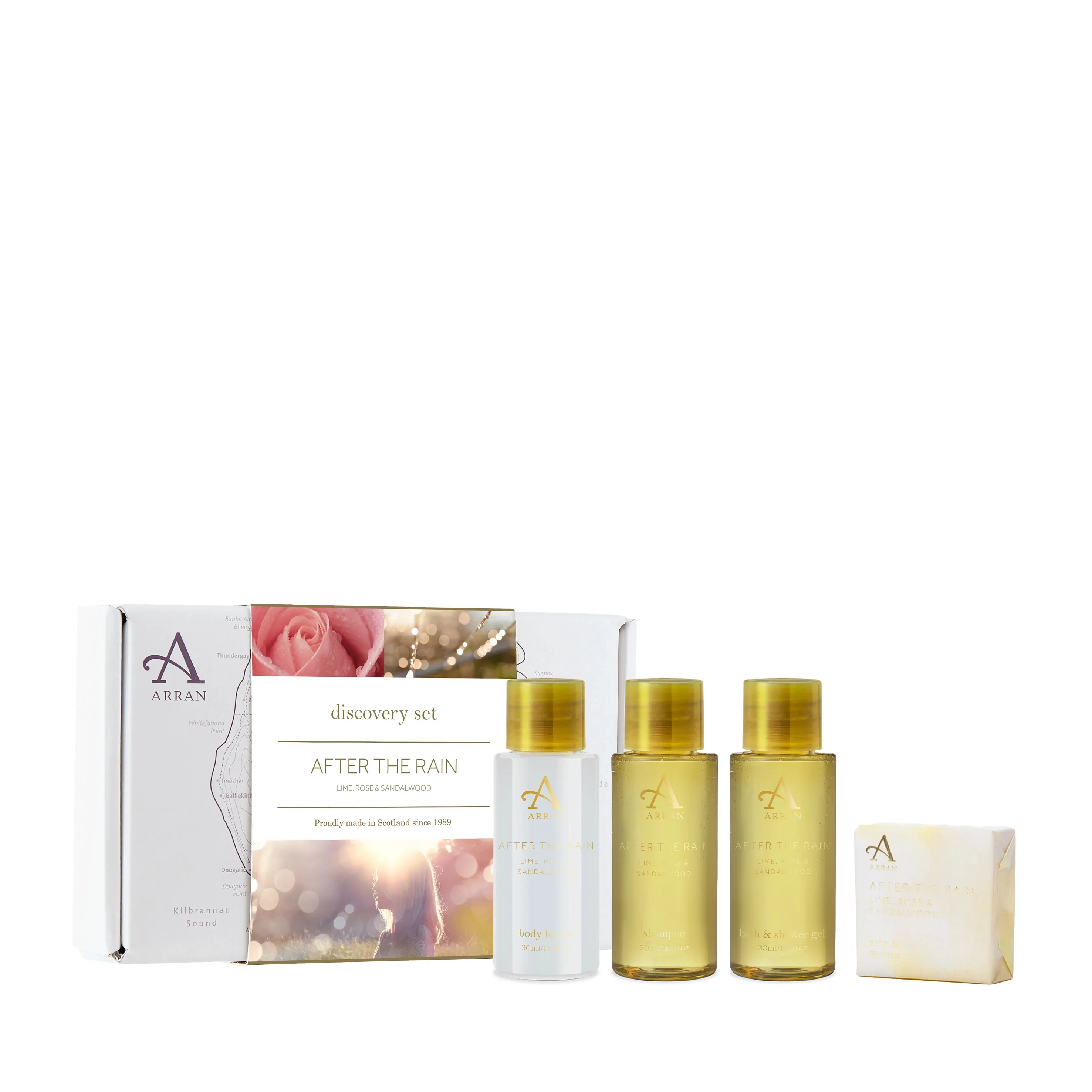 Our signature scent, available in miniature. Introduce loved ones - or yourself - to our timeless blend of lime, rose and sandalwood with ARRAN’s After the Rain Discovery Set. Includes a 30ml Bath & Shower Gel, Shampoo, Body Lotion and Soap. In our new and improved branded gift packaging, which is fully recyclable and more compact to reduce waste. Now contains 100% PCR bottles as we have achieved our eco-friendly commitment. Captivate your senses and shop our most celebrated range here. Product Size Bath & Shower Gel - 30ml Body Lotion - 30ml Shampoo - 30ml Soap - 25g Key points Cleansing formulations Contains pro-vitamin B5 Promotes enhanced skin condition Travel-sized 4 product gift set Fresh, floral fragrance Directions for use Use as often as required, rinsing hair and skin thoroughly. For best results, nourish and hydrate with the After the Rain Body Lotion. Our Collections Arran Collections inspire and connect us to the island – the origin of our thoughts. Inspired by our founders' desire to capture the unique, fresh scent of an Arran garden following a rainstorm, After the Rain is the signature fragrance of our Collections. All proudly made in Scotland since 1989.