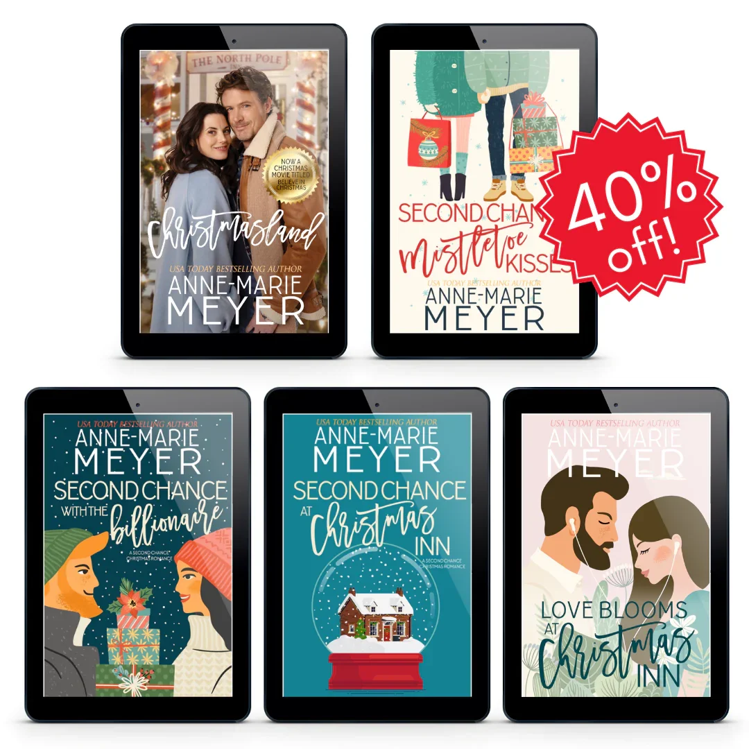 Dive into these SIX sweet Christmas romances this holiday season! ⭐ A Top #100 Amazon Bestseller for USA Today Bestselling author, Anne-Marie Meyer In high school , I was the poor girl who fell for the rich guy. His dad told him to dump me or lose his inheritance. I watched him walk away from me and what we hand. A year later, I got engaged to another man. I wondered if he would come back to stop me, but he never showed, so I forced myself to move on. Six years later, I'm a single mom just trying to make ends meet. It's Christmas time and I only have a few hundred dollars in the bank and 3 small presents for my daughter under the tree. One night, I open my truck door and it swings hard, scratching the Jaguar next to me. A deep familiar voice sounds from behind me and I turn to see the man who broke my heart 7 years ago, standing there with keys in his hand. Read Second Chance Mistletoe Kisses if you love: Second Chance Romances Single Mom Christmas Romance Meddling and quirky Grandmother Buy whatever you want at a Christmas store " Perfect book to snuggle up with in the last few days before Christmas. Parents who think they should interfere with young lovers by threats of shutting down trust funds or college funds should think twice. Life can get pretty lonely when you are left to your own devices. Loved Collin's beautiful attitude and huge heart. So perfect for a broken woman and her very hurt child. Great story that was well told!" ⭐⭐⭐⭐⭐ - Reader "This was the cutest story ever. The angst was on point and the characters relationship was so much better because of it. A really enjoyable story to start the new year." ⭐⭐⭐⭐⭐ - Reader "I loved this story. Quinn and Macie were barely making it, when Quinn runs into a former "friend", Collin, who never really stopped loving her. A series of events lead Quinn and Macie to come live with Collin in his family's home. As the meddling Grandmother sets up Collin and Quinn, they can't quite seem to tell each other what they are feeling. Throw in Macie's father - and it all seems to fall apart. I love how Macie calls Collin her Prince. It was a truly great read and I highly recommend it." ⭐⭐⭐⭐⭐ - Reader The PERFECT holiday romance reads!