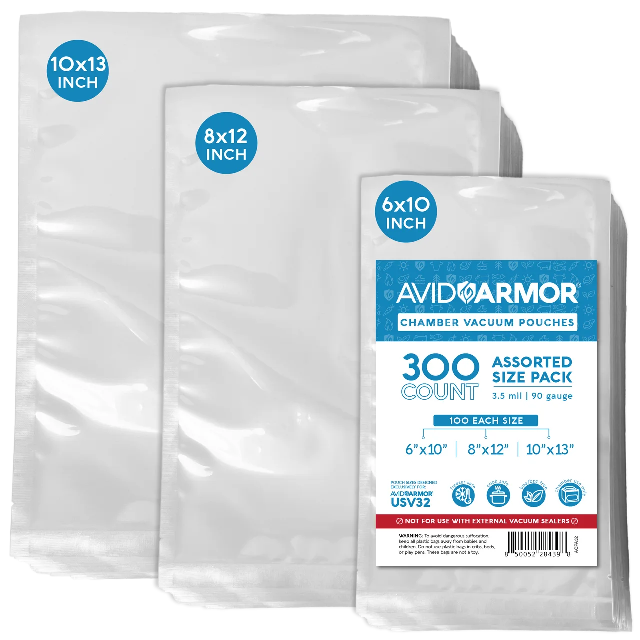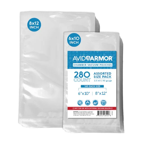 Avid Armor Chamber Vacuum Pouches – 300 Count Assorted Size Pack All-in-One Food Storage Solution with Maximum Versatility Keep food fresh, reduce waste, and streamline your kitchen routine with Avid Armor’s Assorted Size Pack of 300 Chamber Vacuum Pouches. Designed for both everyday and bulk food prep, this set offers the perfect mix of sizes, strong sealing performance, and long-lasting protection. What’s Included 100 Pouches – 10" x 13" 100 Pouches – 8" x 12" 100 Pouches – 6" x 10" Three practical sizes let you seal everything from large cuts of meat to individual portions and snacks—without the need for trimming or custom cutting. Built for Heavy-Duty Food Protection Each pouch is made with 3.5 mil thick, 90-gauge material that blocks air and moisture, helping prevent freezer burn and extending shelf life. Ideal for long-term storage, batch cooking, and meal prep. Safe for Freezer, Microwave, Boil, and Sous Vide Engineered for high performance in various cooking environments. These pouches are safe to microwave, boil, simmer, or use for sous vide recipes, giving you flexible options for preparing and storing food. Food-Safe and BPA-Free Made with BPA-free, FDA-approved food-grade materials, these vacuum pouches ensure safe storage for everything from meats and vegetables to soups and sauces. Reusable and Cost-Effective Each pouch is washable and reusable, making it a more sustainable and budget-friendly option than disposable bags. Simply rinse or place on the top rack of your dishwasher after use. Compatible with the Avid Armor USV32 Chamber Vacuum Sealer Sized specifically for a perfect fit with the Avid Armor USV32 Chamber Vacuum Sealer, these pouches ensure strong, airtight seals every time—no guesswork, no wasted product.