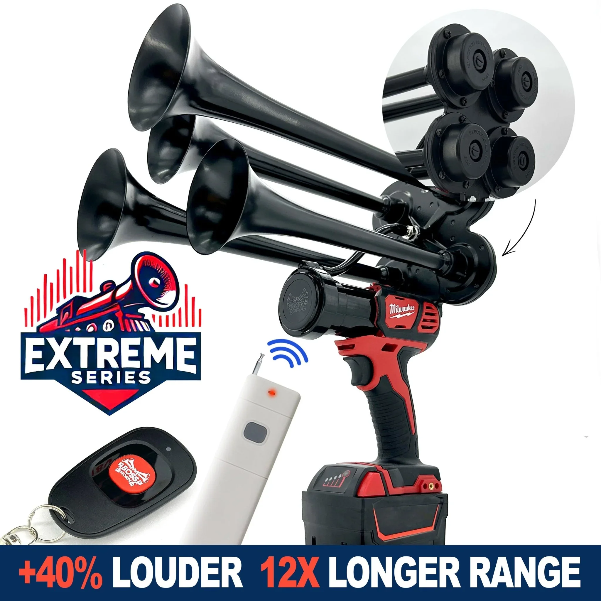 Comparing Each Milwaukee Train Horn Extreme Series Milwaukee Train Horn Features Please check the video to experience the difference Works with any Milwaukee M18 battery Handmade from an brand new Milwaukee Impact Driver Metal trumpets Super long-lasting from 1 charge Produces 150db train sound Up to 160ft remote control operating distance (and up to 2000ft with long-range remote) Same day ship-out Ready to use from the box. Just secure the battery! The Milwaukee Train Horn M18 is an excellent choice if you're in need of a portable and powerful m18 train horn. This device is designed to create a loud and attention-grabbing sound that can be heard from far away. If the Premium Train Horn is outside your budget, take a look at our collection of other Handheld Air Horns . Features of the Milwaukee Train Horn: Handcrafted horn: Each unit is handcrafted to ensure durability and reliability. The sound of 4 trumpets: The four trumpets provide a loud and powerful sound that is perfect for outdoor activities. Battery-powered: No need for power outlets or cords, you can take the Milwaukee Air Horn with you anywhere you go. Remote Control Module: The remote control module allows you to operate the horn from up to 160ft away, giving you the ability to use the horn in a variety of settings. Easy to use: With its simple design, you can easily operate the train horn m18 milwaukee with just one hand. No installation required. Ready to use out of the box! Compatible with Milwaukee M18 batteries: You can power this device with the M18 batteries from Milwaukee, which are sold separately. Perfect for outdoor activities: Whether you're camping, hiking, or attending a sporting event, this best train horn is perfect for making a statement. The Milwaukee drill horn is a versatile and reliable device that is perfect for signaling, having fun, and making a statement. Get yours today and experience the power of loud! Milwaukee Horn for Sporting Events: Maximizing Impact While Ensuring Safety Sporting events are all about excitement, energy, and engagement. The noise level from the crowd often contributes to the adrenaline-pumping atmosphere that players and fans alike thrive on. For those looking to amplify that experience, the Milwaukee Train Horn , a portable handheld tool with remote control, is a powerful option. Its loud, clear, and penetrating sound can electrify the stadium, rally the crowd, and create memorable moments during the event. However, given the intensity of the horn’s sound, there are some essential safety precautions to consider. Why Use the Milwaukee Train Horn at Sporting Events? The Milwaukee Horn is an ideal tool for amplifying the excitement at sporting events. Whether it’s to celebrate a goal, kick off a match, or signal the end of a quarter, the horn adds a dramatic audio punch that traditional noisemakers can’t match. Here’s why the Milwaukee Train Horn is a popular choice: 1. Loud, High-Impact Sound : Designed to produce a powerful sound that cuts through the noise of even the largest crowds. 2. Remote Control Operation : Activate the horn from a distance, making it convenient for event organizers, referees, or fans in the stands. 3. Durability : Built to withstand tough outdoor conditions, the horn is rugged and designed for long-term use. 4. Rechargeable Battery : Powered by Milwaukee’s M18 battery, the horn offers a long-lasting, rechargeable solution—perfect for long, multiple day events. 5. Versatility : Whether you’re coordinating game starts, energizing the crowd, or using the horn in emergency situations, it’s a multifunctional tool suitable for various event needs. While the Milwaukee Train Horn can elevate the atmosphere at sporting events, it’s essential to take precautions when using it, especially given its extremely loud sound. To ensure a safe and enjoyable experience for everyone, follow these safety guidelines: • The Milwaukee Train Horn produces a very loud sound, which can potentially harm hearing if not used responsibly. Continuous exposure to high-decibel sounds can cause hearing loss or discomfort, especially if people are close to the source. • Recommendation : Ensure the horn is not used too close to spectators or players. Ideally, it should be operated from a distance using the remote control feature. It’s best to keep the horn aimed away from crowds and avoid prolonged or continuous blasts.