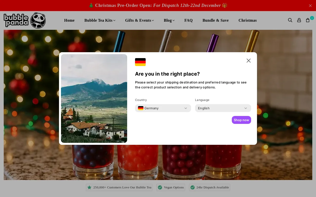 Make Your Own Bubble Tea Kit Make delicious bubble tea at home! Create your own personalised bubble tea making kit, delivered directly to your door. Indulge in the delightful world of bubble tea with Bubble Panda's Make Your Own Bubble Tea Kit. This all-inclusive kit provides everything you need to create your favourite bubble tea flavours at home. Get creative, mix and match your favourite flavours Makes 8 regular or 4 large bubble tea drink All you need is ice, a mixing bowl or shaker and milk or milk alternative (100ml) for the milk teas Premium bubble tea ingredients Vegan friendly New ingredients introduced regularly Enjoy a fun and creative experience, and savour the unique taste of freshly made bubble tea from the comfort of your own kitchen with Bubble Panda. ***PLEASE NOTE: Our boxes are best consumed within 30 days and use by 60 days of receiving your order.*** Please note this kit DOES NOT contain bubble tea straws. If required, they can be added from the 'Any Extras?' section below. Allergen Information: All ingredients may contain traces of nuts.