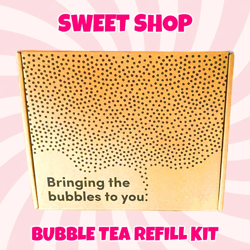 We’ve pick ‘n’ mixed a selection of sweet treats and transformed them in to bubble tea! A great box for kids and a bit of nostalgia for us adults! Raspberry Lemonade Green Tea, Raspberry Lemonade Syrup & Raspberry Bubbles Bubblegum Green Tea, Bubblegum Syrup & Blueberry Bubbles Candy Floss Green Tea, Candy Floss Syrup & Strawberry Heart Jelly Cherry Cola Assam Black Tea, Cherry Cola Syrup & Cherry Bubbles Please note this kit DOES NOT contain bubble tea straws. Click here to view our range of accessories. ***PLEASE NOTE: Our boxes are best consumed within 30 days and use by 60 days of receiving your order.*** Allergen Information: All ingredients may contain traces of nuts.