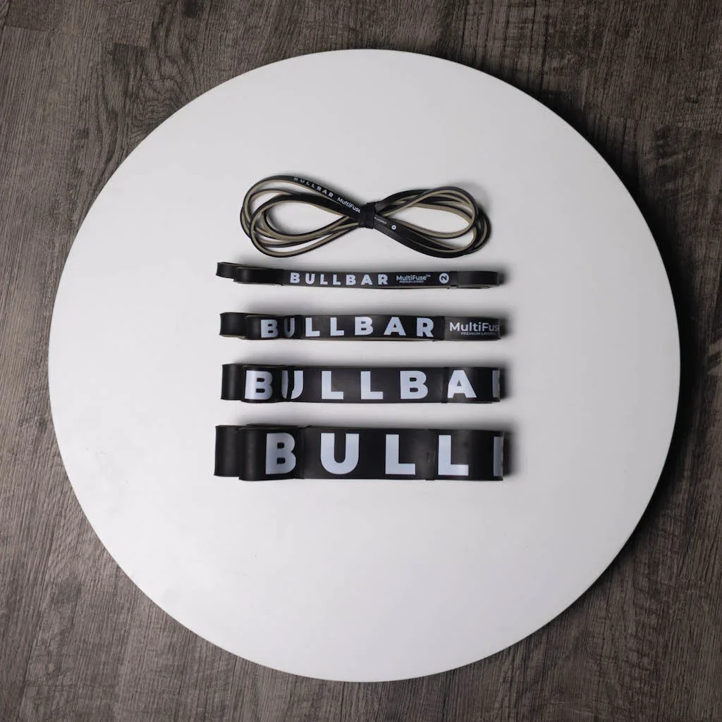 The BULLBAR Multifuse (TM) Resistance Band Set takes your workout to the next level—anytime, anywhere. These five premium bands range from light to extra heavy resistance, allowing you to scale your strength and mobility training with ease. Band Specs: #1: 3-30 lbs (length: 41 in, width: 1/4 in, thickness .18 in) #2: 5-50 lbs (length: 41 in, width: 1/2 in, thickness .18 in) #3: 10-60 lbs (length: 41 in, width: 13/16 in, thickness .18 in) #4: 25-80 lbs (length: 41 in, width: 1-1/4 in, thickness .18 in) #5: 50-120 lbs (length: 41 in, width: 1-3/4 in, thickness .18 in) MULTIFUSE™ Technology - Unlike standard bands commonly found on mass-market retailer sites, which are made from a single molded piece of rubber, Multifuse bands are crafted using a proprietary method that layers multiple ultra-thin sheets of rubber. This unique design provides superior strength and durability. With molded rubber bands, a single crack can quickly lead to a complete break. In contrast, Multifuse bands are reinforced with multiple bonded layers, dramatically reducing weak points and extending their lifespan. Strength meets reliability—engineered to last. ADAPTABILITY - From warm-ups to assisted pull-ups and even resistance added workouts utilizing the patented BULLBAR's band anchors, this set covers it all. Perfect for mobility drills, strength training, and explosive power moves. PORTABILITY - Compact and lightweight, the set fits in its included carry bag, so you can train at home, in the park, or your next family road trip. VERSATILITY - Train every muscle group with hundreds of possible exercises—squats, deadlifts, rows, and even assisted pull-ups. DURABILITY - Made from premium latex, these bands are designed to endure the toughest workouts. Science says resistance bands provide continuous tension, which improves muscle activation and joint stability while reducing injury risk. Build strength. Recover faster. Train smarter. “Finally, resistance training that travels as well as I do!” – Jean-Claude Van Damme, probably.”