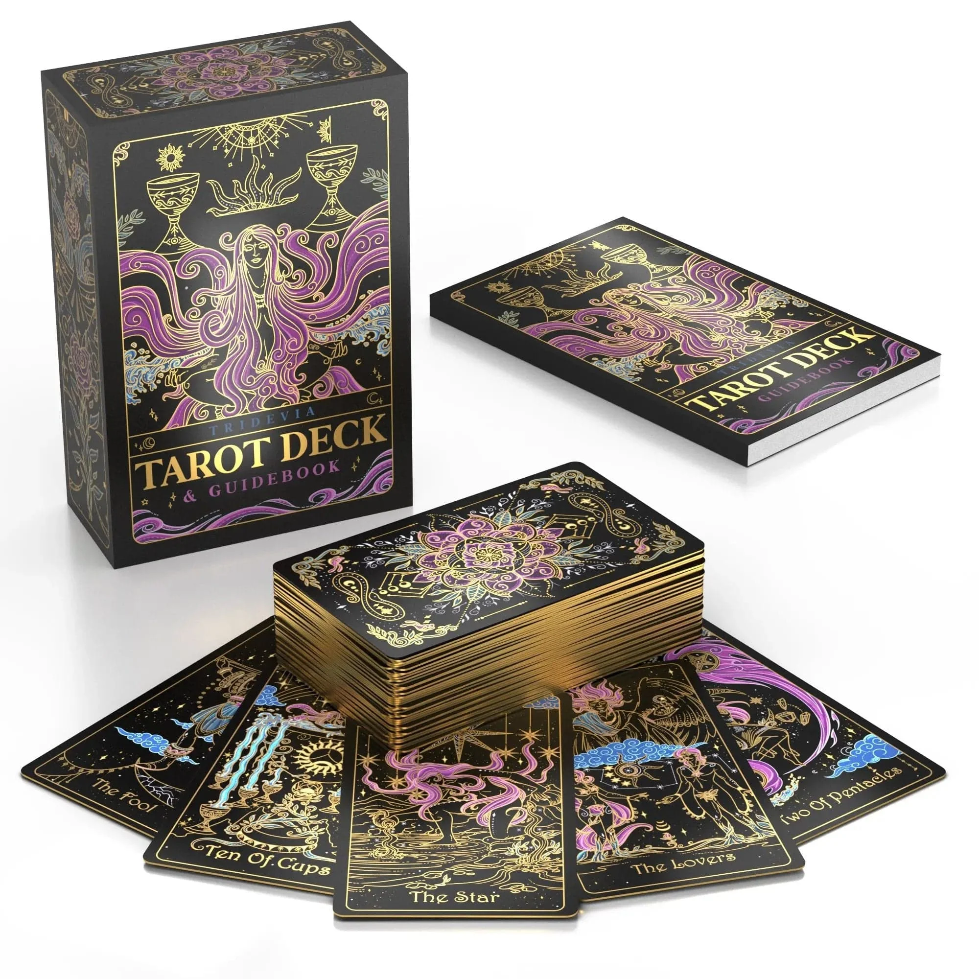 Illuminate Your Spiritual Journey — Complete Tarot Set Consisting of 78 Golden cards with meanings on them, (22 Major Arcana and 56 Minor Arcana) with Gilded Edges, 100-page Guide book and a matching sturdy deck box. Tarot Decks Unique Design — The Tridevia Tarot Card, is influenced by the original Rider-Waite Classic tarot cards for beginners infused with a feminine and celestial aesthetic, enhanced by intricate golden details and luxurious gilded edges. This tarot card set unique visuals will spark your imagination! Unlock The Secrets of Cards Reading — Our comprehensive tarot cards set with guide book contains 100-pages with 156 uplifting affirmations, and detailed meanings for each card. Dive into the depths of the Tarot and unlock its transformative wisdom. Perfect as tarot cards for beginners, and for experienced tarot readers who enjoy good tarot cards set with guide book. Captivating Gift for Women — Tarot cards set holds a tradition of being shared. Tridevia by Calmoura luxury set is the ideal present for anyone who seeks to be empowered! Perfect for admirers of oracle deck, crystals and oracle cards set, as well as enthusiasts of astrology, numerology, and manifestation practices. Personal Development & Self-discovery — Tarot deck is great for exploring intuition, connecting to your Higher Self and celebrating your divine feminine energy! With affirmation card meanings you will be motivated and inspired to make positive choices. Explore the mysteries of the universe and upgrade enlighten your path of mystical exploration!