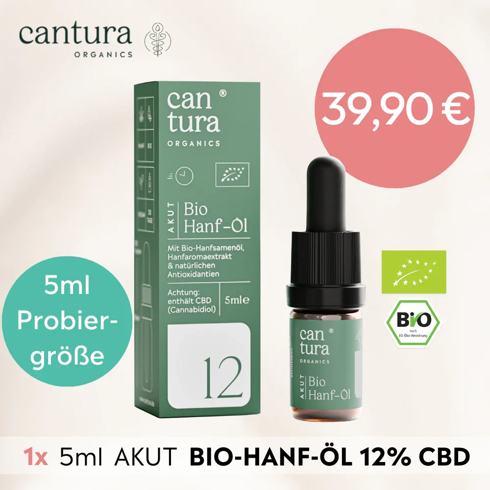 Unser Versprechen an dich Versandkostenfreie Lieferung europaweit Nur die besten Wirkstoffe für deine Gesundheit 30 Tage Geld-zurück-Garantie Das BIO-Hanf-Öl: Cantura AKUT 12 mit 12 % CBD und zitronig-mildem Hanfgeschmack. Zusammen mit euch haben wir unser beliebtes Cantura Öl nochmals optimiert. Herausgekommen ist unser neues Cantura AKUT 12. Durch den milderen, leicht hanfigen Geschmack mit Zitrusnote im Abgang ist es ideal für den Einstieg oder für alle, denen die klassischen Öle zu bitter schmecken. Ein besonders schonendes Verarbeitungsverfahren bewahrt das ausgewogene Terpene- und Cannabinoidprofil und garantiert den unverwechselbaren Hanfeffekt im Aroma. Neben den ungesättigten Fettsäuren Omega-3 und Omega-6 ist es besonders reich an Vitamin E und trägt dadurch bei, die Zellen vor oxidativem Stress zu schützen. Gewonnen wird unser Öl ausschließlich aus EU-zertifiziertem Nutzhanf, welcher auf naturbelassenen Böden und unter den strengen Regeln der biologischen Landwirtschaft heranwachsen darf. Selbstverständlich zu 100% geprüft und BIO-zertifiziert. Achtung! Hanfaromaextrakte enthalten natürlicherweise CBD! CBD/Tropfen 4 mg Vitamin-E/Tropfen 1,3 mg (18% NRV) Trägerflüssigkeit Bio-Hanfsamenölmischung max. THC-Gehalt < 0,2 % 70 μg (BfR-Richtwert je Tagesdosis) Inhalt 10 ml Tropfen ca. 300 Anwendung und empfohlene Tagesdosis: Das Öl kann direkt unter die Zunge getropft werden und sollte dort einige Minuten behalten werden, damit sich das Aroma entfalten kann. Die empfohlene Tagesdosis (siehe THC-Richtwerte des BfR): ein Tropfen Das Öl sollte kühl und dunkel gelagert und vor direkter Sonneneinstrahlung geschützt werden. Vor Gebrauch gut schütteln. Inhaltsstoffe: Bio Hanfaromaextrakt (enthält natürlicherweise Cannabinoide, Terpene, Flavonoide) Bio Hanfölmischung (enthält ungesättigte Fettsäuren Omega-3 und Omega-6, Vitamin E und weitere Mineralstoffe) natürliches Vitamin E (Tocopherol) Qualitätsmerkmale: Biozertifiziert ohne Gentechnik Glutenfrei und vegan frei von Pestiziden und Schwermetallen mild-zitroniger Hanfgeschmack Mindesthaltbarkeitsdatum: Ungeöffnet 24 Monate ab Verpackungsdatum haltbar. Nach dem Öffnen noch 12 Monate haltbar. Inhaltsstoffe: #Bio-Hanföle Unsere Hanfpflanzen werden in Familienbetrieben auf biozertifizierten und nachhaltig bewirtschafteten Feldern angebaut. Aufgrund der optimalen landwirtschaftlichen und klimatischen Bedingungen können wir komplett auf Dünger und künstliche Bewässerung verzichten. Die Verarbeitung unserer Pflanzen erfolgt besonders langsam und schonend, denn nur so können wir so viele natürliche Inhaltsstoffe erhalten wie möglich. Besonders wichtig ist uns dabei die Erhaltung der Terpene. #β-Caryophyllen β-Caryophyllen ist ein weiteres Terpen, das in unseren Hanf-Pflanzen vorkommt. Es ist besonders interessant für uns, weil es - ebenso wie CBD - den CB2-Rezeptor unseres Endocannabinoidsystems aktiviert und somit dieselben Körperprozesse wie CBD ausbalanciert. β-Caryophyllen haben wir zu verdanken, dass unser Rohöl würzig bis scharf schmecken kann. #ɑ-Bisabolol Alpha-Bisabolol ist ein typisches Blumen-Terpen, das uns unbewusst sehr vertraut ist – etwa von Kamillenblüten. Feine Noten des typischen Kamillengeruchs machen den Geschmack unseres Rohöls so besonders. #ɑ-Humulen Hast du schonmal ein Bier getrunken? Dann kennst du den Geruch von Humulen nur zu gut. Denn der Geruch von Hopfen besteht zu einem großen Teil aus Humulen. Aber auch in unserem Rohöl kommt es in signifikanten Mengen vor und verleiht ihm seinen erdigen Geschmack. Weitere Hinweise Hier haben wir alle wichtigen Hinweise und Informationen rund um die Themen Anwendung und Produktkonformität für dich aufbereitet: Hier weiterlesen Hinweis zu länderspezifischer Produktkonformität: Um die Einhaltung aller nationalen Gesetze zu gewährleisten, passen wir die Etikettierung und die damit verbundene Verwendungsbestimmung unserer Produkte an die jeweiligen nationalen Rahmenbedingungen an. Daher kann die Kennzeichnung (z.B. Hinweise zur Anwendung und Produktkategorie) je nach Lieferland abweichen. Ausschlaggebend für die korrekte Nutzung in deinem Land ist stets die Etikettierung auf der Produktverpackung, die du erhältst. Abbildung kann vom tatsächlichen Produkt abweichen.Solltest du Fragen zu Kennzeichnung oder lokalen Vorschriften haben, steht dir unser CANTURA-Team jederzeit persönlich zur Verfügung. Anwendungshinweise: Das Produkt ist ausschließlich gemäß den Anweisungen auf dem Etikett zu verwenden. Die angegebene empfohlene tägliche Anwendungsmenge darf nicht überschritten werden. Vor dem ersten Gebrauch das Produkt auf Unversehrtheit prüfen. Qualität und Zufriedenheit garantiert: Solltest du eine Beschädigung am Produkt feststellen, melde dich jederzeit bei uns. Wir kümmern uns sofort um den Austausch. Weitere Hinweise: Nach Anbruch kühl, trocken und vor direkter Sonneneinstrahlung geschützt lagern und zügig verbrauchen. Nicht während der Schwangerschaft oder Stillzeit verwenden. Produkt außerhalb der Reichweite von Kindern aufbewahren. Nicht für Kinder und Jugendliche unter 18 Jahren geeignet. EU-Nutzhanfprodukte können Wechselwirkungen mit Medikamenten hervorrufen. Bei chronischen Erkrankungen vorher ärztlichen Rat einholen. Dieses Produkt ist nicht für die langfristige Verwendung ohne ärztliche Rücksprache vorgesehen. Alle Angaben ohne Gewähr. Dieses Produkt enthält ausschließlich EU-Nutzhanf, verarbeitet im Rahmen der geltenden gesetzlichen Grenzwerte. Die Produkte werden regelmäßig von unabhängigen DAKKS -akkreditierten Laboren geprüft. THC-Grenzwerte können je nach Land variieren—bitte informiere dich über die für dich geltenden Bestimmungen.
