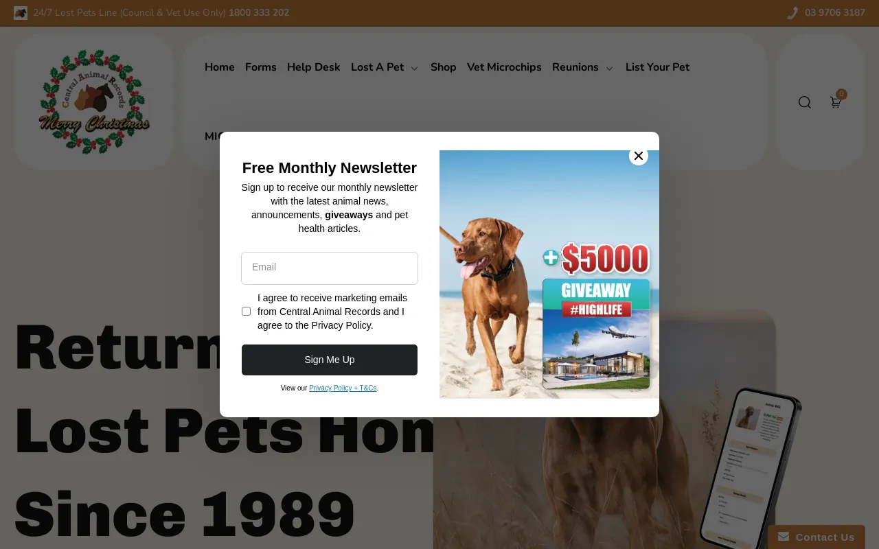 Central Animal Records is Australia's largest microchip database for pets with 5.9 million pets currently listed. We offer a 24/7 recovery service and have helped get over 3 million lost pets home. We offer free online access for pet owners as well as a premium V.I.Pet service to help better protect pets.