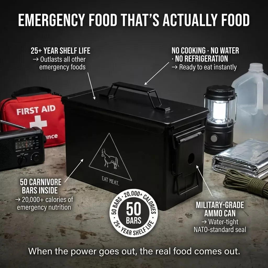 The Ammo Box is perfect for the hardcore Carnivore Bar enthusiast looking for enough bars to last on long adventures and for long-term storage. *Please note that all Ammo Box orders require an adult signature upon delivery* Each box includes 50 shelf-stable, nutrient-dense Carnivore Bars, and one Carnivore Bar bandana stored in a military-style Ammo can with a watertight seal. The ammo boxes are perfect for carnivores, low-carb, keto-based, and animal-based enthusiast alike! All items are final sale and are ineligible for return or exchange. We highly recommend purchasing a single bar sample before placing a larger order.