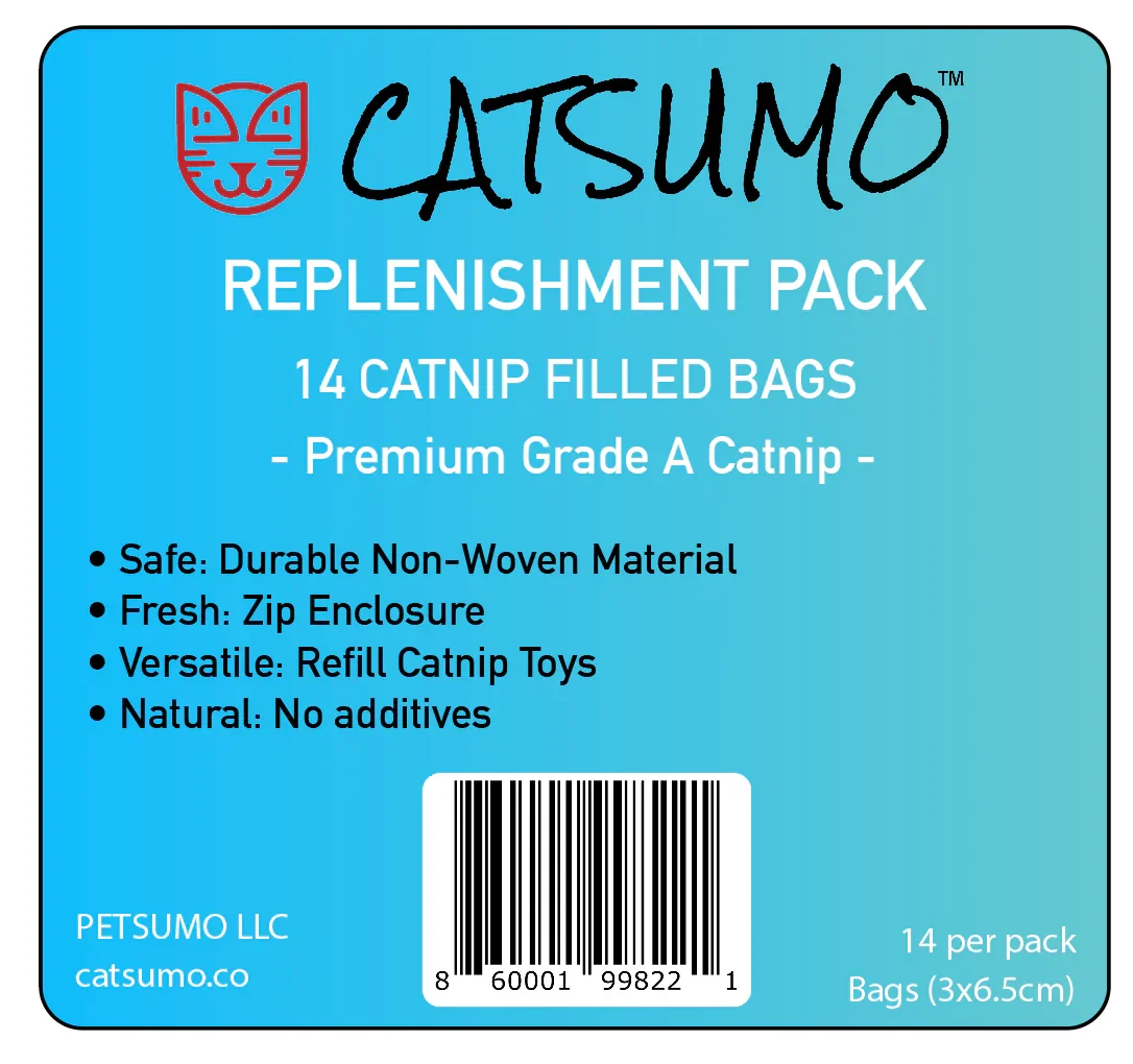 14pcs per pack Catnip bag dimensions: 3x6.5cm Great for the CATSUMO Wrestler and other toys Hassle and mess free