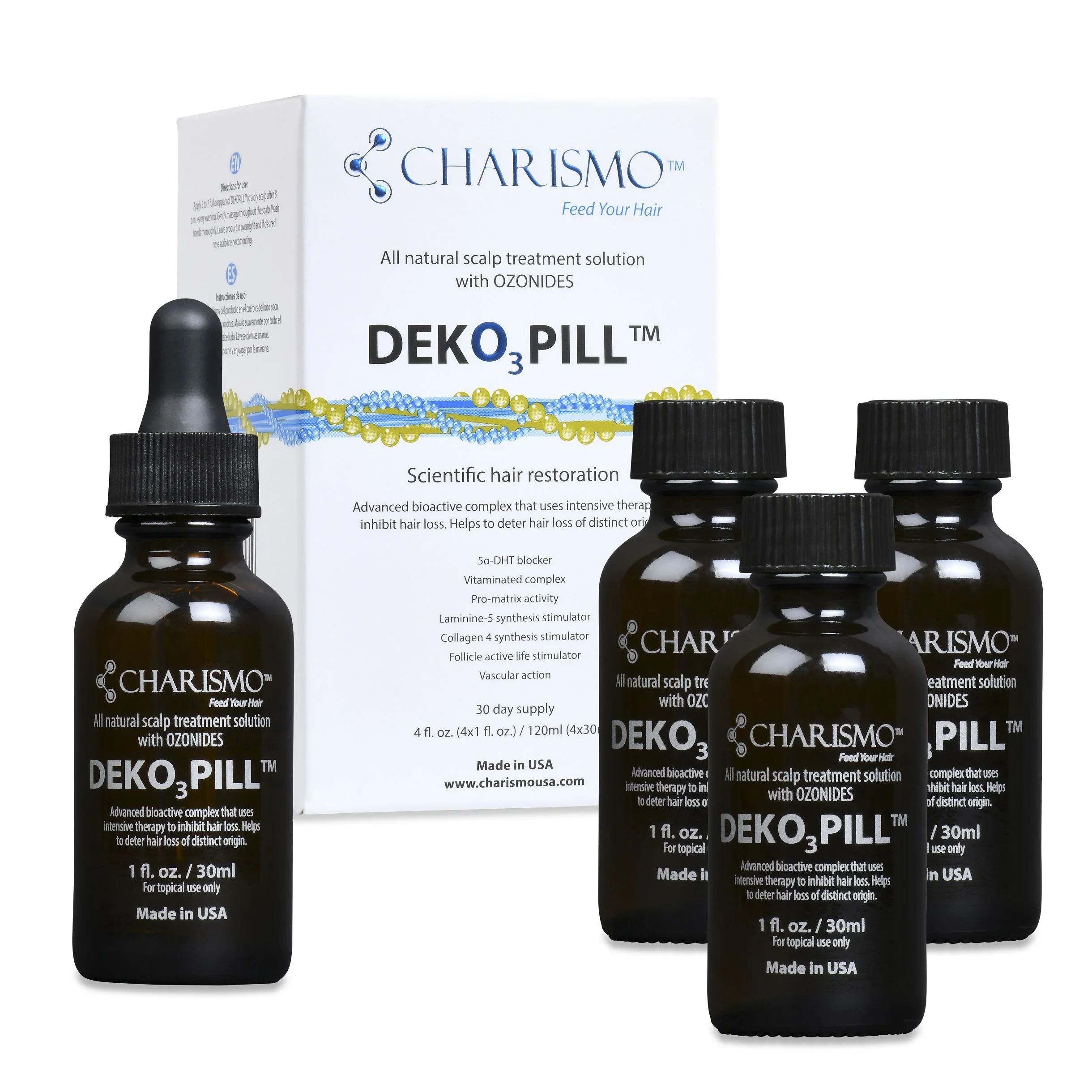Advanced Serum for Fuller, Healthier-Looking Hair – 3 Month Supply Regular shedding is normal! Most people lose about 50–100 strands each day. DEKOHAIR™ is a targeted serum formulated to support your scalp while revitalizing the appearance of thinning areas. One 60 mL bottle supplies approximately 30 days of treatment. This specialty pack contains a full 3-month supply! EXPLORE DEKOHAIR™ SUPPORTS ROOT VOLUME: visible improvement in density and body within 30 days REVITALIZES & RENEWS: promotes stronger, healthier-looking strands and enhanced shine when used consistently BIOACTIVE HERBAL PEPTIDES COMPLEX: contains a patented blend of botanical DHT-blockers, vitamins, tripeptides, and advanced anti-thinning actives TIME-RELEASE DELIVERY SYSTEM: encourages scalp circulation for eight hours or more while simultaneously nourishing your follicles LIGHTWEIGHT, NON-DRYING SERUM: ensures optimal absorbency with no oily or sticky residue LOW-MAINTENANCE ROUTINE: designed for long-term support of fuller-looking hair