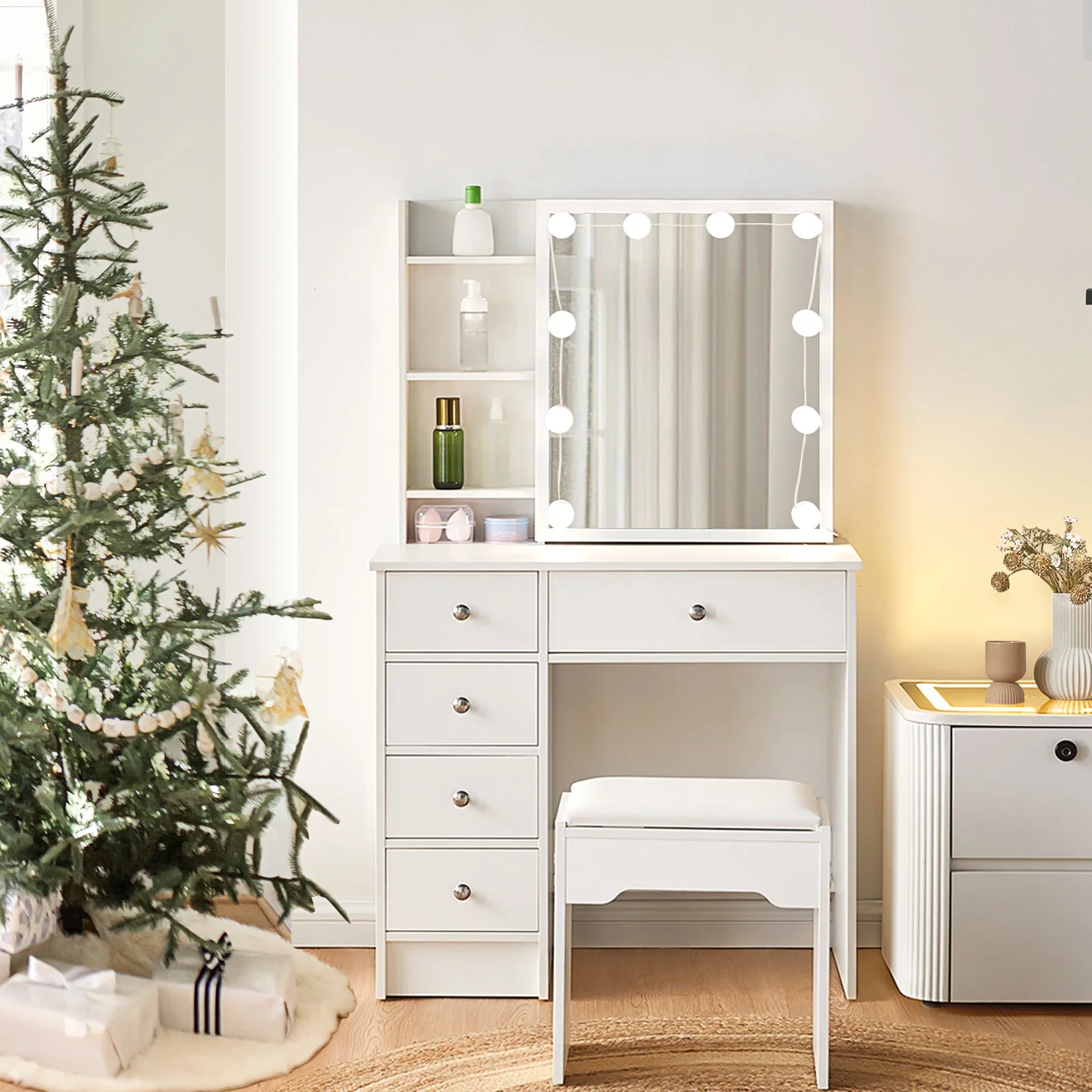 Design: This elegant chic Vanity Table Set come with a 52x90cm large size mirror,12 adjustable led bulbs lights, 4 storage drawers and 1 cabinet. 1 soft cushioned stool. Feature with 12 dazzling LED bulbs to achieve maximum light output per bulb, cool / neutral / warm light technology, the vanity make up table sets is perfect for videos, selfies and precise make-up application. Chic Hollywood style: The Hollywood dressing table set is the classic Hollywood vanity experience with added adjustable led bulbs and soft pu padded stools. Cool to Warm lighting: 12 adjustable bulbs lights with CE and Rohs certification. 3 lights option in choice of cool / neutral and warm light for flewless make-up application. Easy control for different brightenss: Come with a easy operation controler to adjust the brightenss easily to fits your need. Large Storage: 2 large drawers, 2 small drawers with 1 cabinet,offer plenty space to organize your cosmetics and jewellery. 105x40cm ex-big table top provides enough space to place your daily lotion,liquid foundation and other commonly used cosmetics and favorite ornaments.