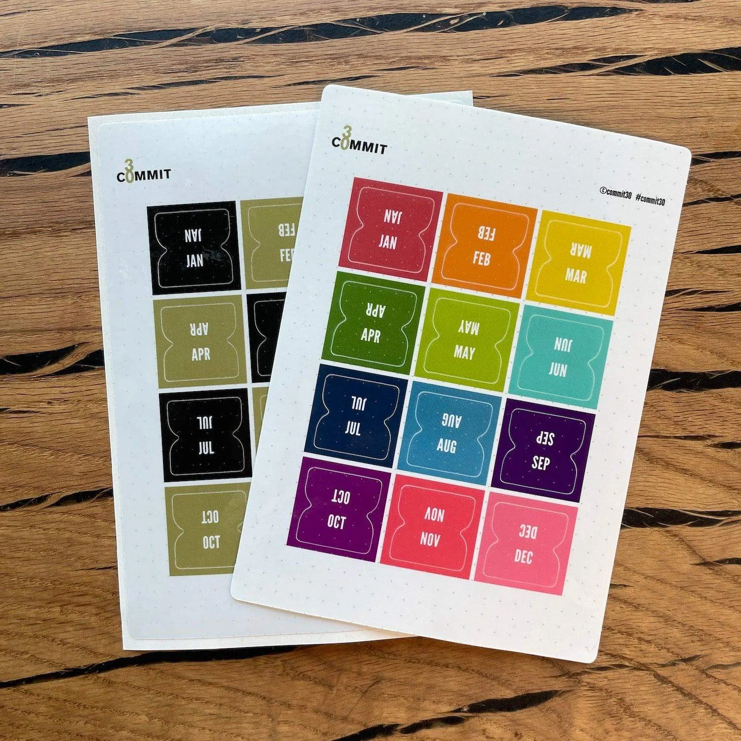 The Monthly Adhesive Tabs are ideal for our Commit30 planners, or many other stationery and scrapbooking projects. The color coordinated Black and Gold or the Rainbow colored monthly tabs are the perfect accessory for the undated or dated Commit30 planners. These tabs are designed to help mark every month in your annual planner. For installation tips checkout our blog post HERE