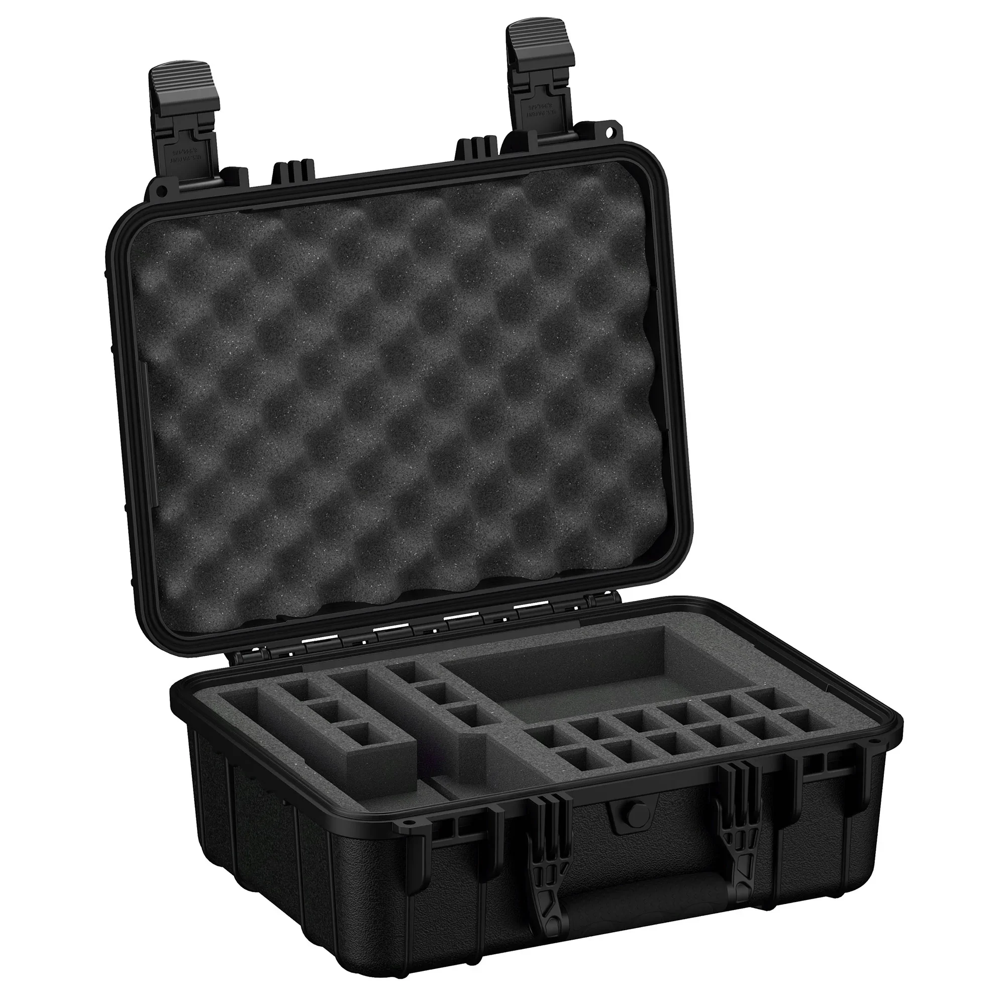 This 18" Case #801 has pre-cut foam for 5 pistols, 20 magazines, and accessories. Pistol forms are 9.75” length x 1.25” width x 4” deep. Magazine forms are 0.875" x 1.25" and 4" deep. Includes convoluted (egg-crate) foam in the lid. *Fits with optics and flush mounted lights. Oversized flared magwells may have issues in the base of the foam.