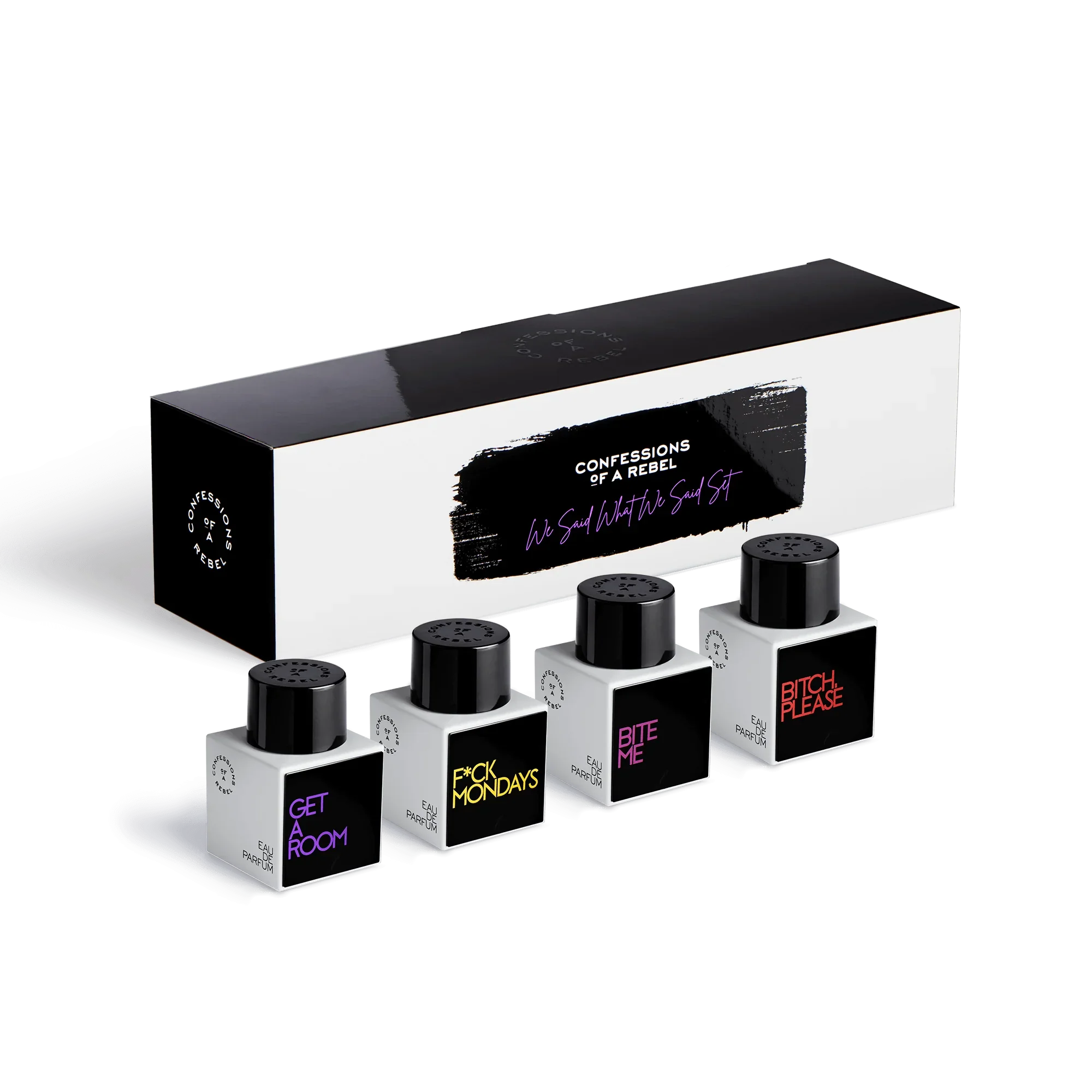 Say what you mean, mean what you say, and do it loudly with no regrets---this four-piece mini set acts as the final punctuation mark on your pointed statement. Whisper sweet everything with the woody-fruity blend of Get a Room, or get their pulse racing with the gourmand goodness of Bite Me. Let the citrus woody blend of F*ck Mondays serve as a vibrant conversation starter, or allow the audacious woody fruity mix of Bitch, Please be the quick-witted comeback that leaves the whole room laughing in its wake. What you said was the tea, and it's not going back in the pot. What's included: Mini Get a Room (20 ml / 0.68 oz) Mini Bitch, Please (20 ml / 0.68 oz) Mini F*ck Mondays (20 ml / 0.68 oz) Mini Bite Me (20 ml / 0.68 oz)