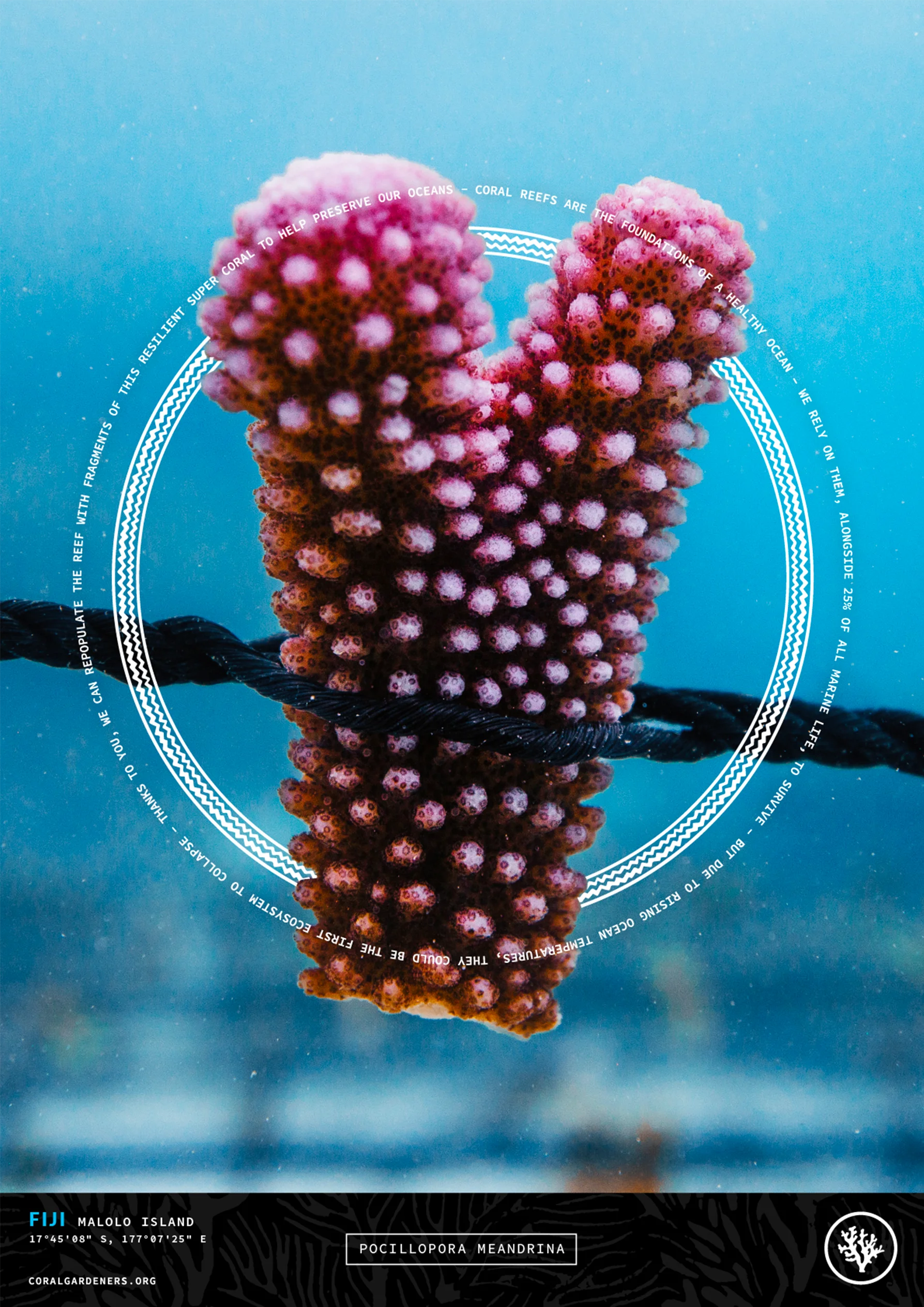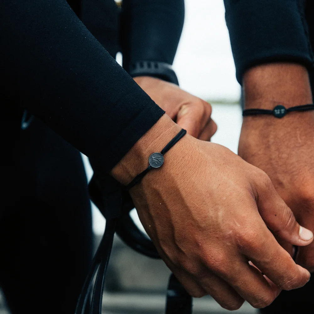 Our signature bracelet is handcrafted from recycled polyester cords, which threads a minimalist, black stainless steel coral medallion. You can order your bracelet or gift it to support our mission. 100% of proceeds support our coral restoration activities on the field. The location of the nurserie support is engraved at the back.