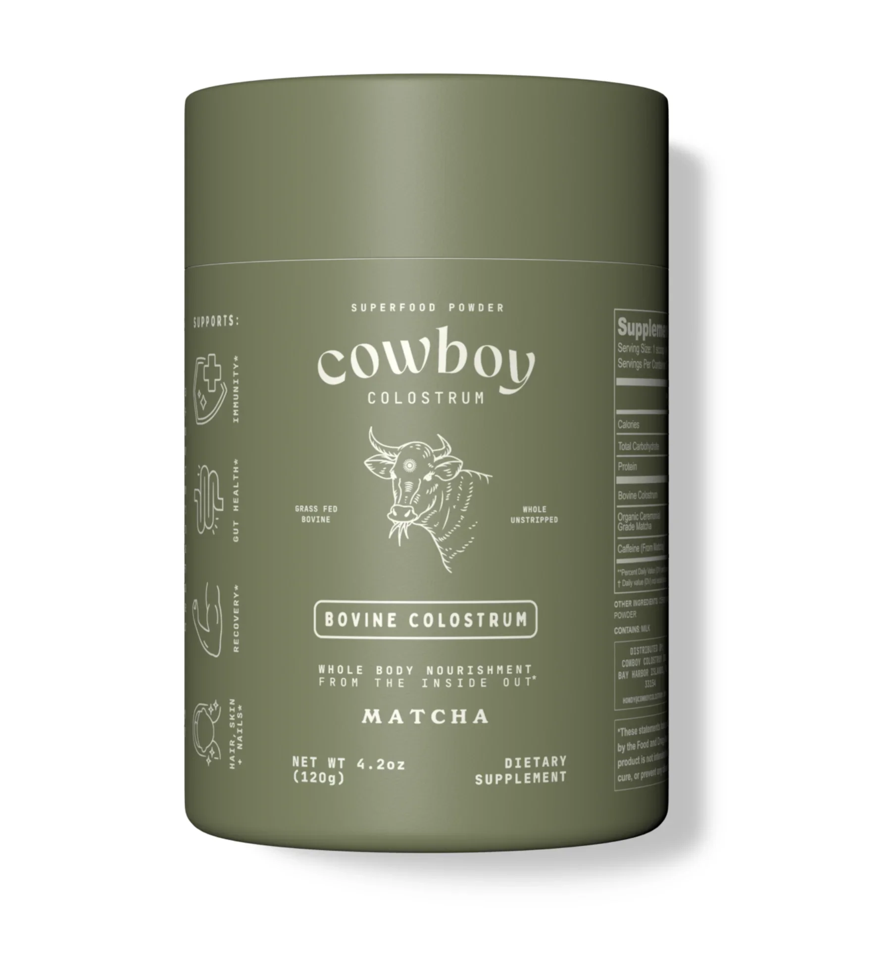 Matcha Ingredients: Grass-fed Bovine Colostrum, Ceremonial-Grade Matcha Powder Each serving of Matcha Cowboy contains 1g of matcha (30mg of caffeine). Vanilla Ingredients: Grass-fed Bovine Colostrum, Organic Madagascar Vanilla Powder, Organic Monk Fruit Extract, Sea Salt First milking colostrum from grass-fed U.S. raised dairy cows. Rich in bioactive ingredients like immunoglobulins and natural growth hormones to support immunity, gut health, radiant skin + hair and athletic performance. We prioritize calf welfare first and sustainably harvest our colostrum only after the baby calves get their share. Simply froth into water or u pgrade your coffee or smoothie instantly with Cowboy's rich, creamy texture and delicious taste. For best blending results, use our high speed frother or any electric blender.