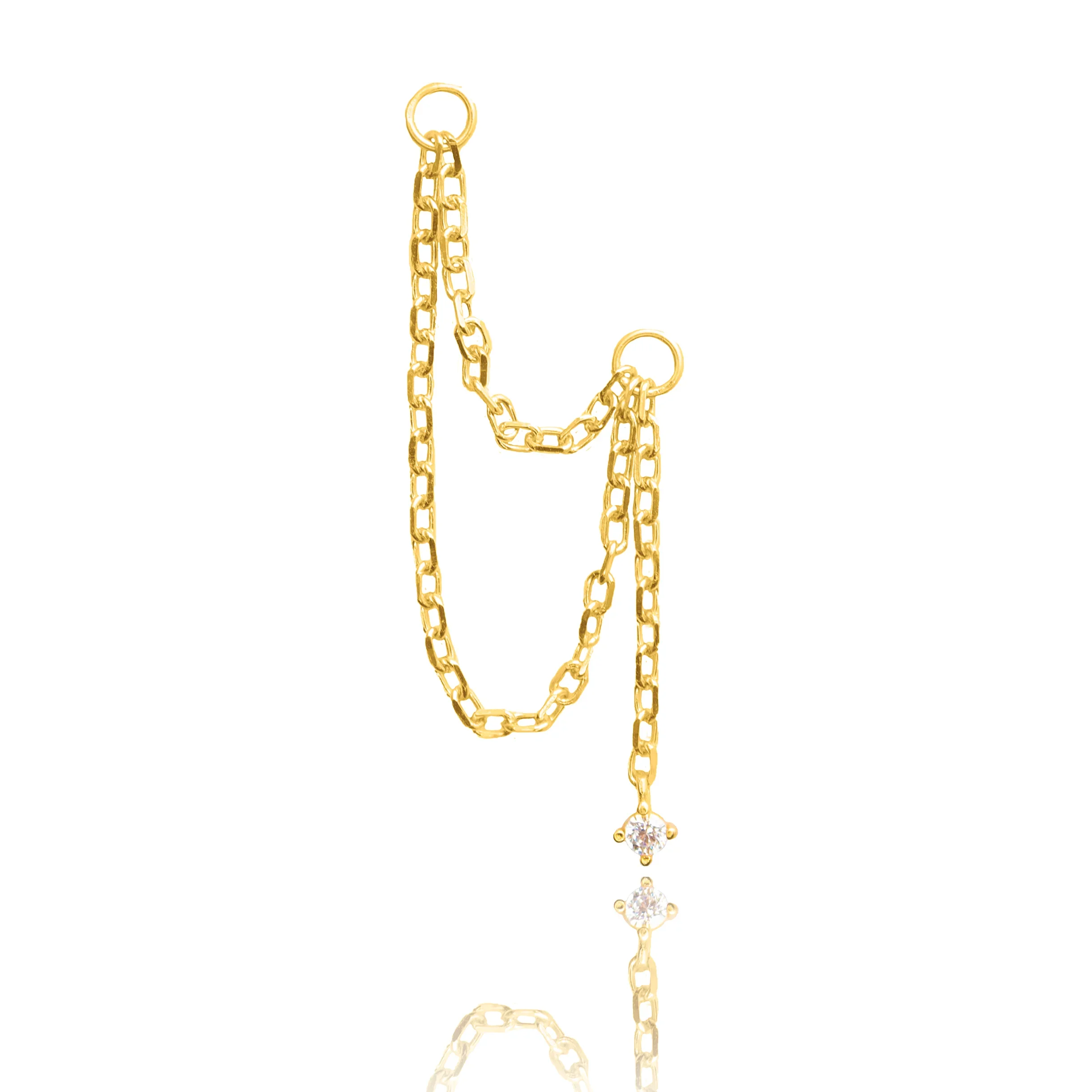 Make a statement with our Layered Drop Chain Charm, featuring delicate double chain detailing and suspended crystal for a touch of sparkle. Material: 925 Sterling Silver Chain Length: 25mm (shortest chain) Sold as a single chain charm Create your signature layered ear stack by adding a chain charm. The loops easily attach to huggie hoops or cartilage clickers for endless possibilities.
