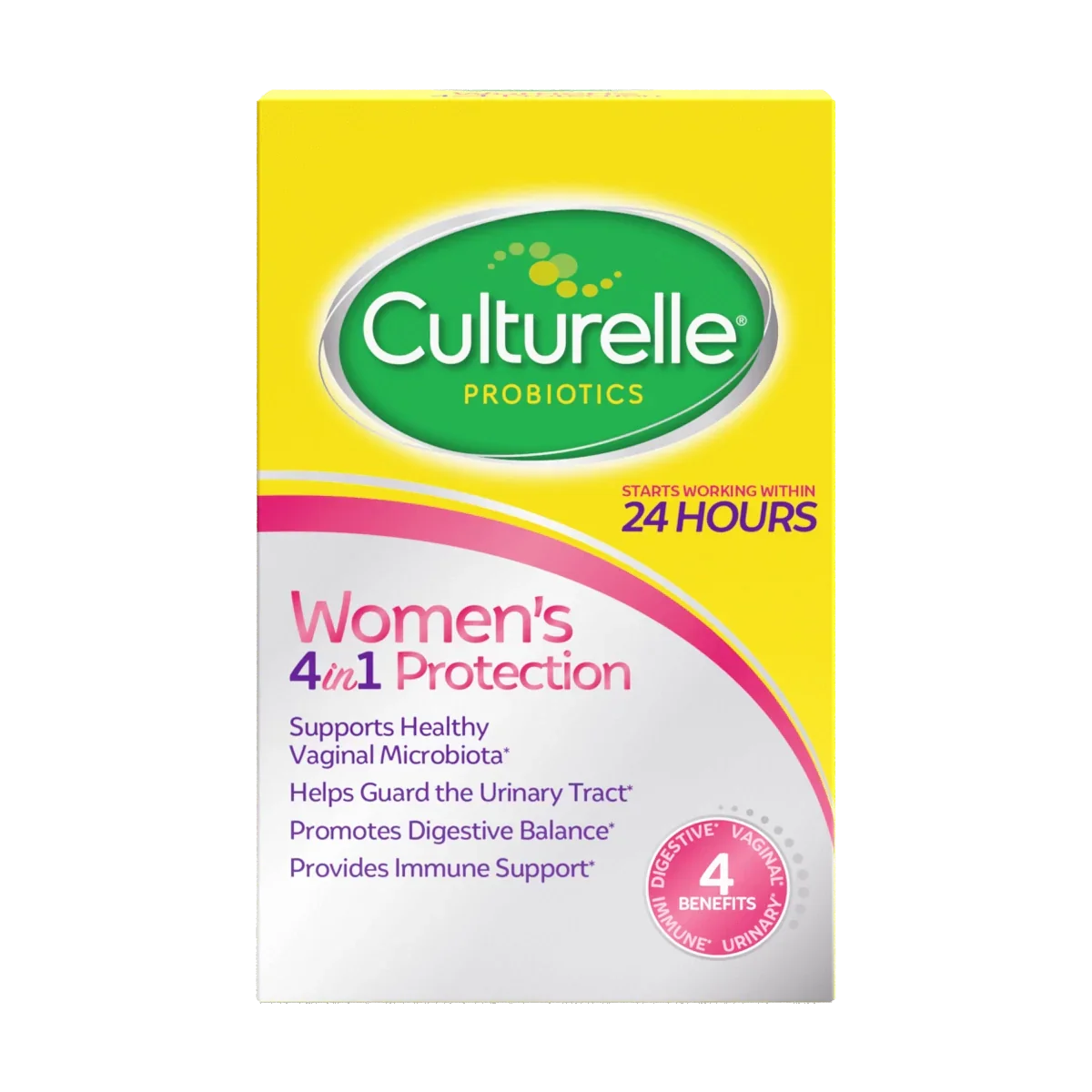 Designed to provide women with complete feminine care – four benefits in one probiotic capsule: vaginal, urinary, digestive and immune health* Promotes healthy vaginal microbiota to support pH balance for feminine health* Helps guard the urinary tract from unfriendly bacteria and designed with a prebiotic blend that starts working within 24 hours* Supports digestive health and helps reduce occasional digestive upset, diarrhea, gas & bloating* Helps restore natural balance of good bacteria in your digestive tract, where 70% of the immune system resides*