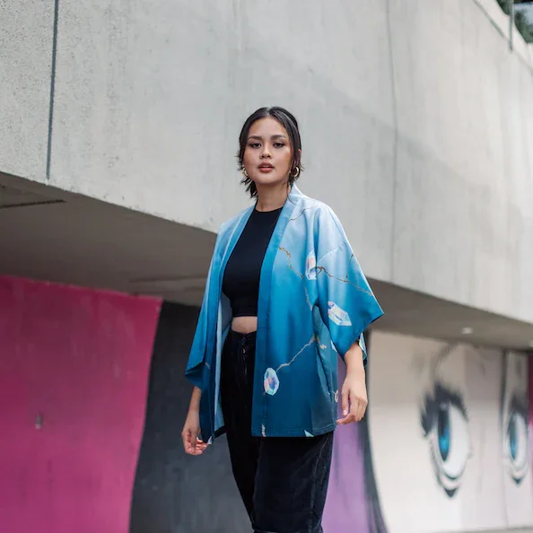 Custom cut, streetwear style Haori Jacket with Between Broken inspired designs. Subtle color gradient fabric with re-interpreted Dabin Mask design on back. Kintsugi gold lines throughout, inspired by Dabin's newly released album, Between Broken.