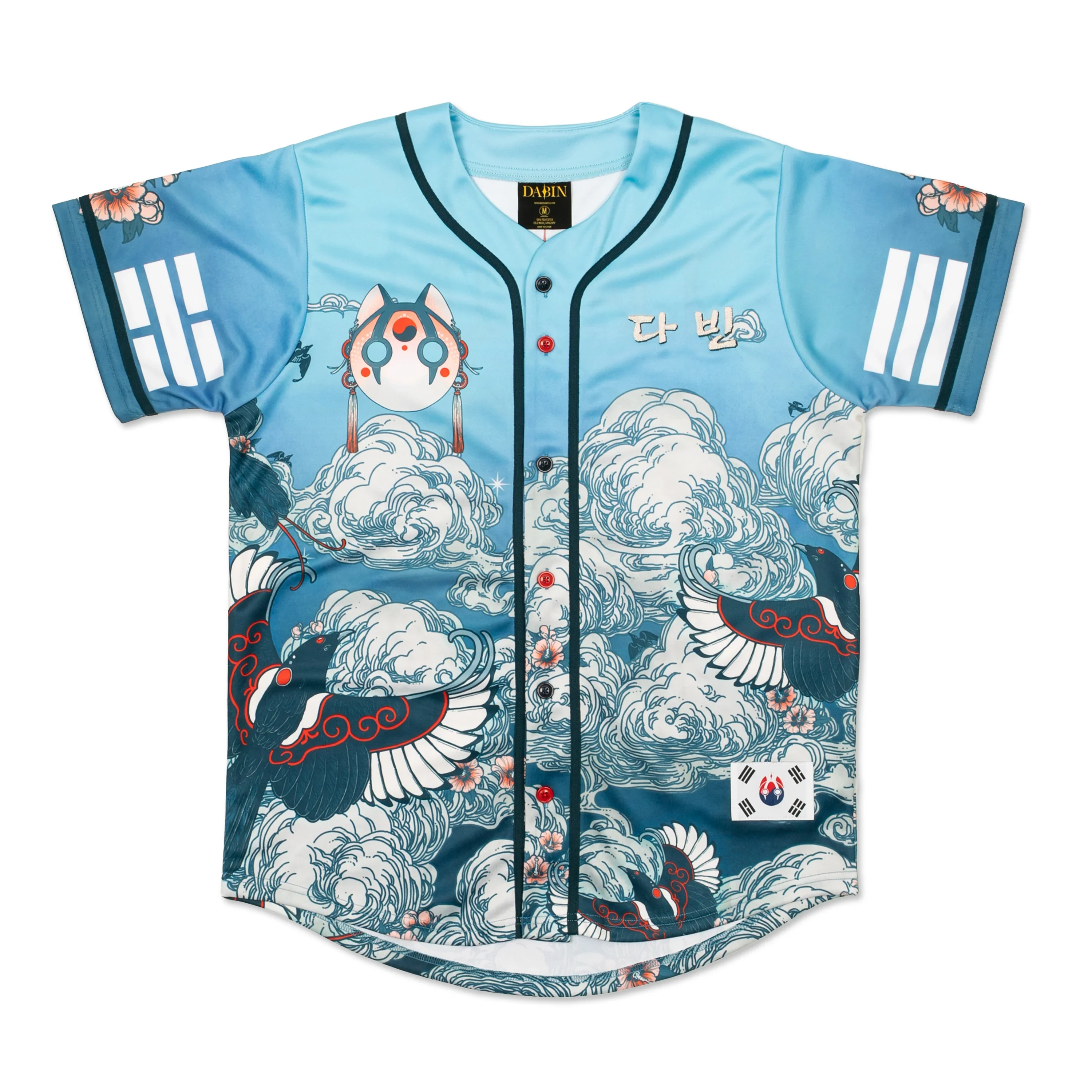 Premium quality, embroidered Dabin Hanguk baseball jersey. Fully custom design, inspired by Dabin's Korean heritage. Featuring an embroidered rendition of the Dabin mask design and an embroidered Dabin text logo on the back, plus "Dabin" written in Korean text, embroidered on the front chest. The four trigrams from the Korean flag are placed on the front & back of each sleeve. Custom woven patch of a Korean Flag rendition on lower front. Alternating blue and red custom buttons.