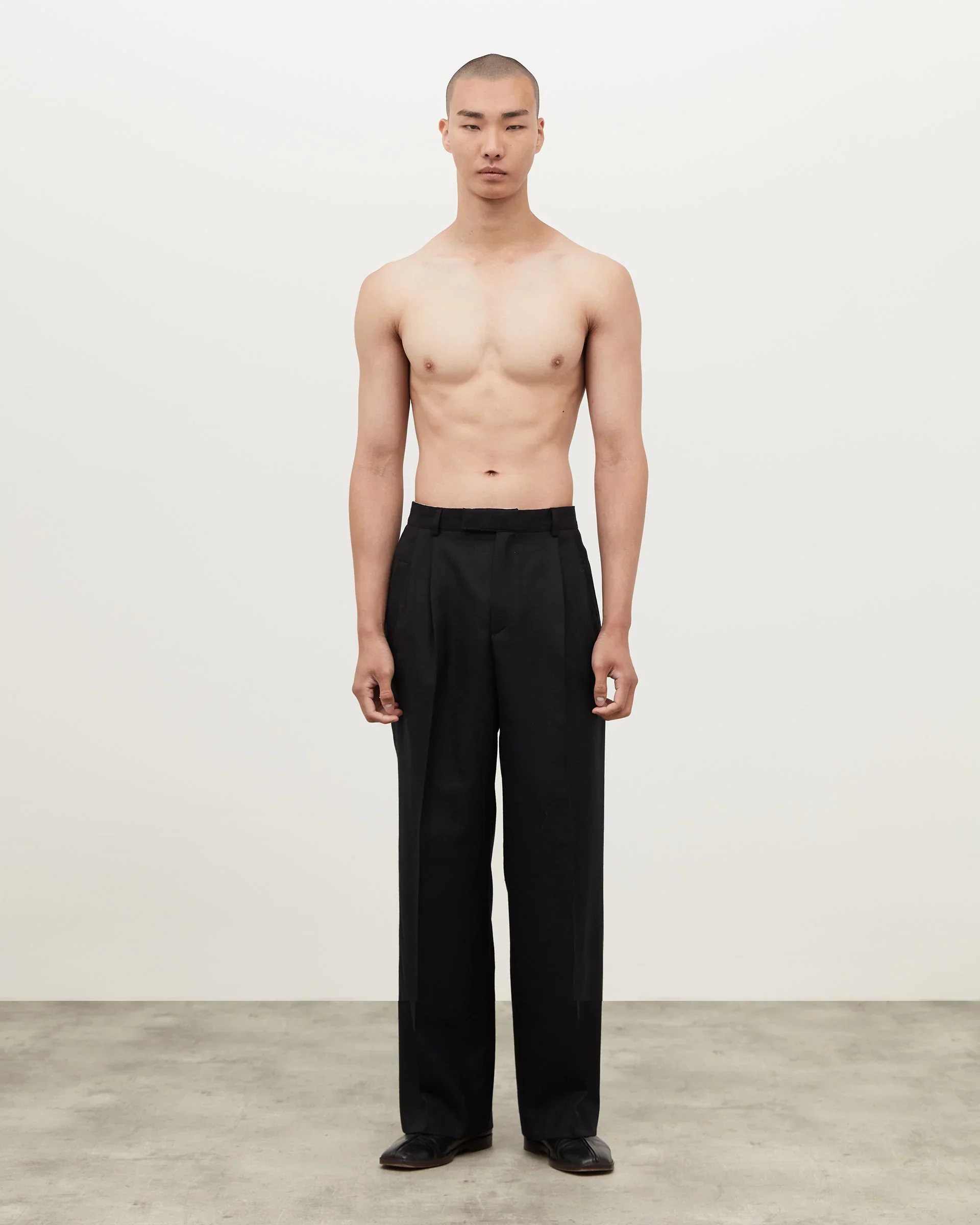 This is our Forest Pleated Trouser in black. It's made in Portugal from 100% virgin wool with a twill finish for a subtle texture that elevates trousers. This trouser is tailored for a high-waisted finish with pleated front detailing and a wide-leg cut. It features two front-panelled pockets and two rear pockets, with a hook and bar closure. These trousers have been designed for a sartorial look, helping elevate any outfit and combining beautifully with the rest of our tailoring range. The Forest Pleated Trouser are a dry clean only product.