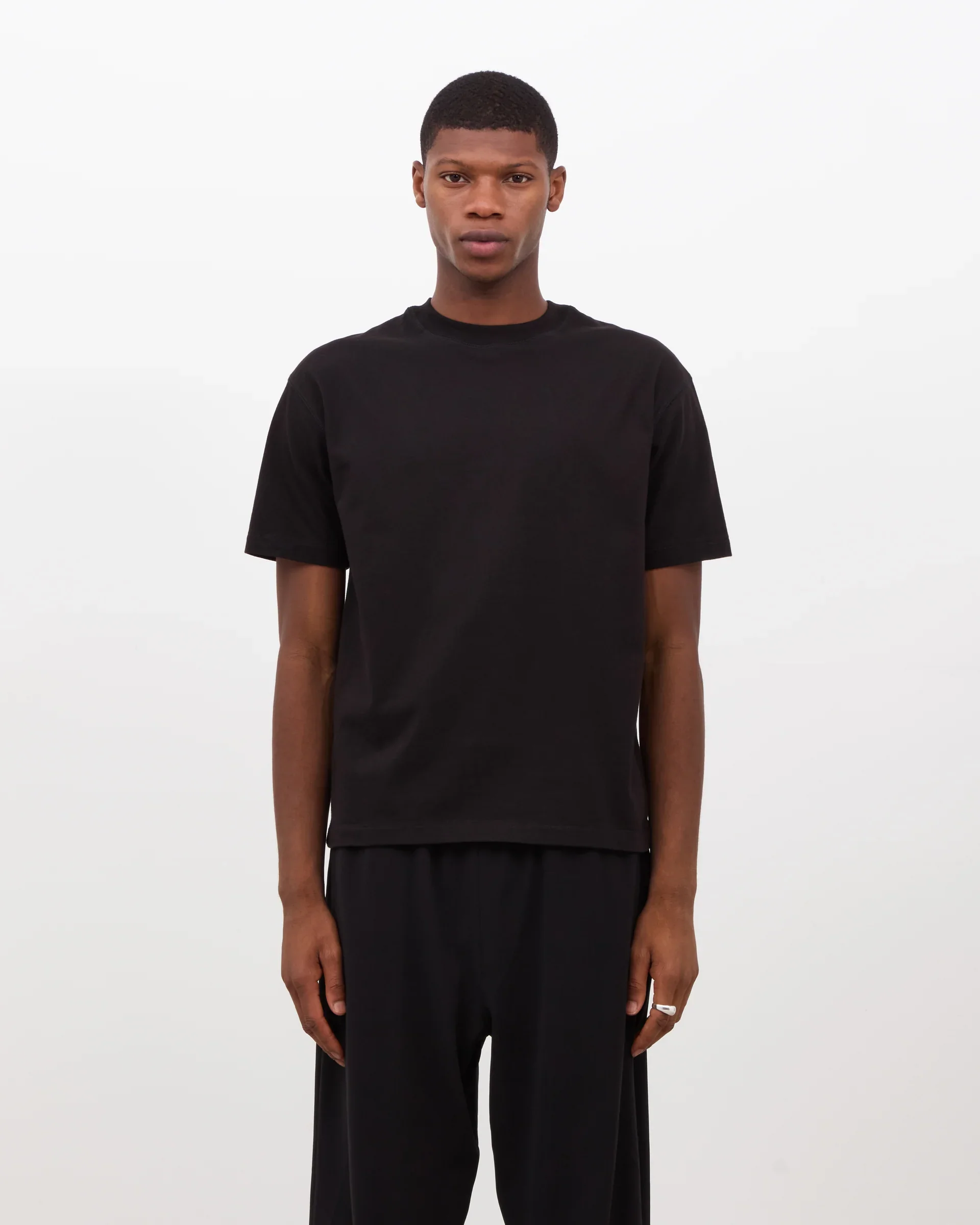 This is our Box Fit T-shirt (cropped) in black, made in England from a luxury heavyweight 100% cotton jersey coming in at 380g. It features a high ribbed neckline with cover-stitch detailing throughout. With a cropped length designed to finish at your waistline. This T-shirt is designed to be worn day after day and hold its structure wash after wash. It’s Perfect for layering as well as a stand alone piece with beautiful detailing throughout, giving this T-shirt an elevated fit and a luxury heavyweight feel.