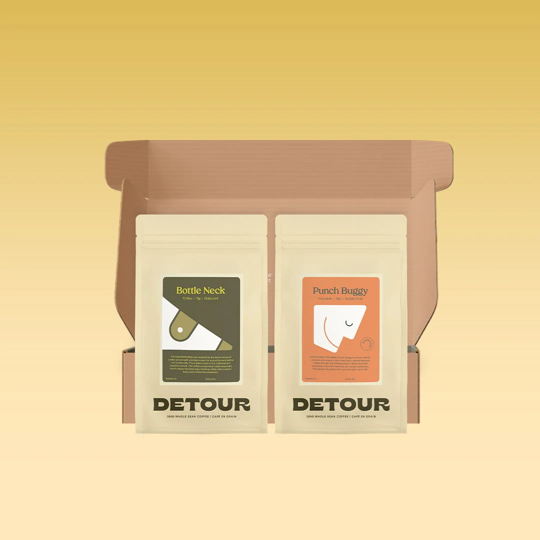 What's in the Pack? Punch Buggy - Like the classic VW beetle, Punch Buggy is unique, friendly, and suits all occasions. As Detour’s flagship coffee, this blend is built around the love of coffees from the Cachoeira da Grama farm in Brazil; Punch Buggy maintains a Brazil base while rotating fresh, vibrant seasonal Central American coffees through the blend. We love it for its rich and balanced profile, with sugar browning aromatics leading to a syrupy texture and sweet notes of deep chocolate, hazelnut and cherry. Bottleneck -Bottleneck is sweet and balanced with sugar-browning aromatics, leading to a creamy texture and smooth, comforting notes of fig and toffee. Built around the love of an everyday, approachable, and easy-drinking filter coffee, Bottleneck typically combines coffees from Colombia, Guatemala, and Costa Rica—but no origin is ever really off the table! We love it for its attention to balance, creamy texture, and toffee-like sweetness. Bouncy Castle - Built on our love of African coffees, this coffee is bright, buoyant, and makes us happy! Bouncy Castle typically showcases a single-origin washed Ethiopian coffee but is open to any sparkly coffees as long as there’s something vibrant, sweet, and fun in the flavour. We love it for its floral aromatics, tea-like texture, fruit-forward acidity, and sweet, juicy finish. — All bags are 300-grams each. Detour coffees are sold as whole beans only.
