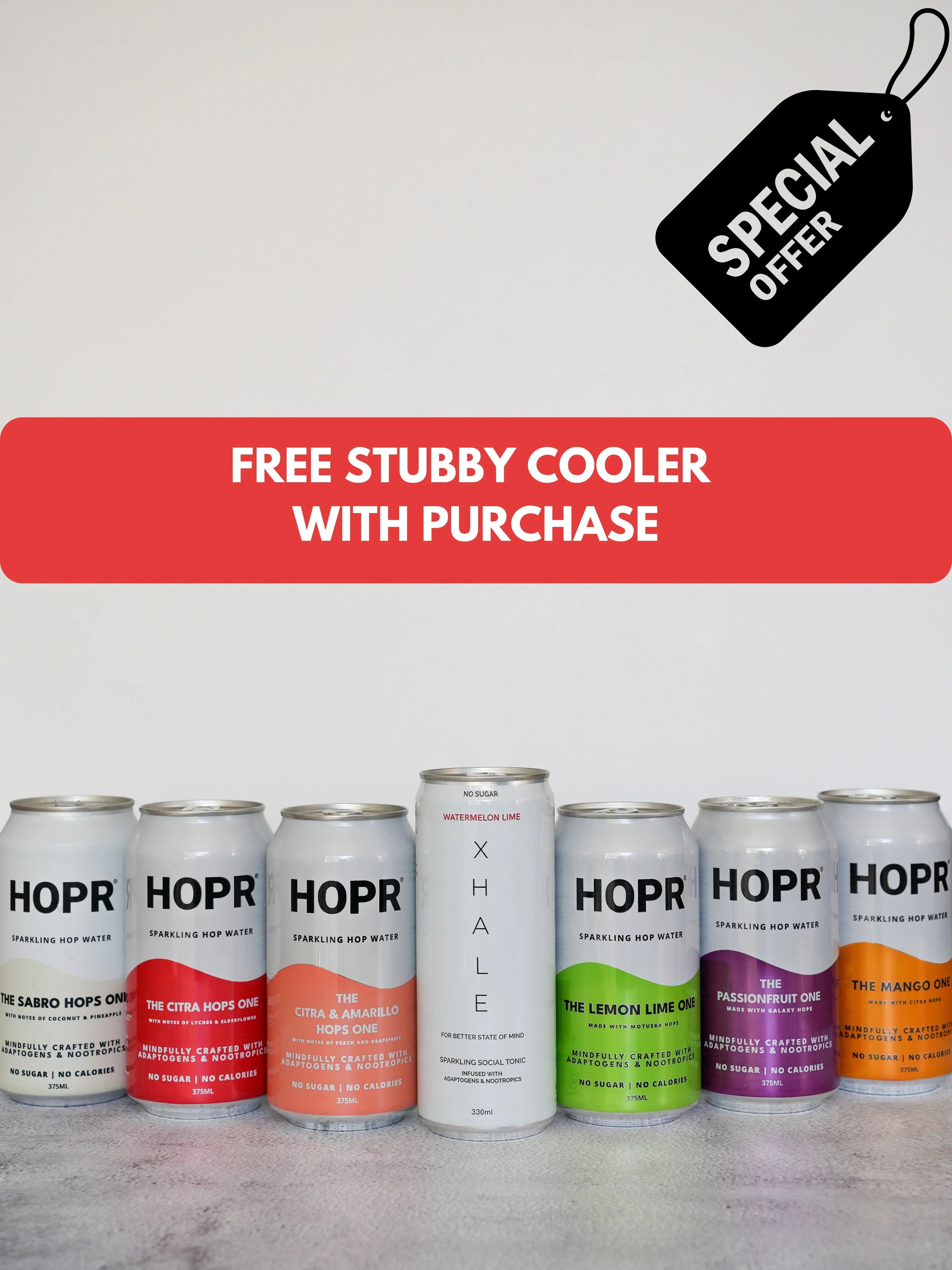 Try our entire range! This pack has 30 cans for everyone and every occasion. Key Features Zero Sugar Zero Calories Zero Carbs Gluten-Free Each bundled case includes: 24 - Pack - 375ml 4x The Citra Hops One 4x The Citra & Amarillo Hops One 4x The Mango One 4x The Passionfruit One 4x The Lemon Lime One 4x The Sabro Hops One 6 - Pack - 330ml XHALE watermelon lime (3 cans) XHALE cucumber mint (3 cans) 1x Stubby Cooler