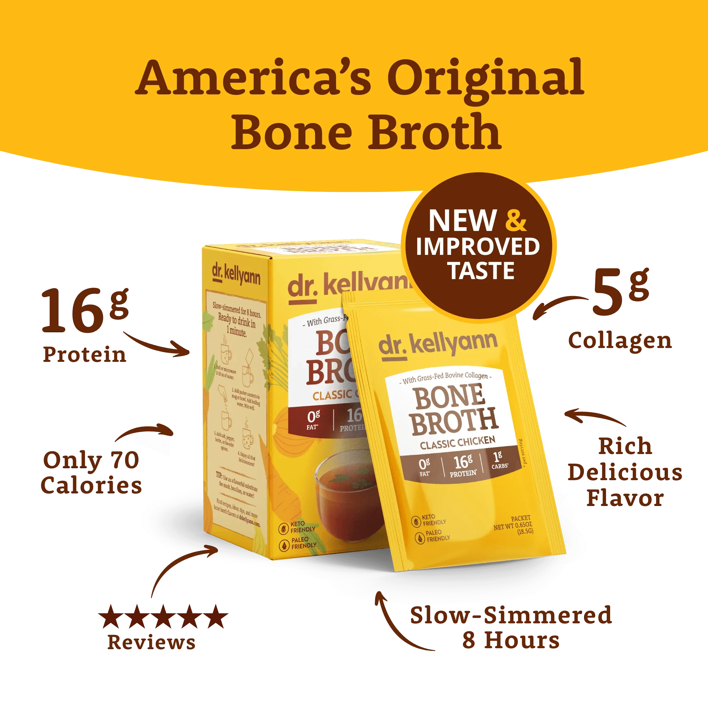 Classic Chicken Bone Broth Healthy. Delicious. And Oh So Easy. Dr. Kellyann's Bone Broth is crafted with one goal in mind: to deliver powerful nourishment to your brain and body in convenient, easy-to-prepare, on-the-go servings. Consuming 1-2 packets of Dr. Kellyann's Bone Broth per day aids in supporting gut health and is ideal for intermittent fasting, GLP-1 diets, and weight loss programs. It's rich in nutrients, contains 0 sugar, and is high in protein, making it great for diabetics, seniors, and those on carnivore or paleo diets. This delicious bone broth is excellent for recovery, boosting immunity, and supporting skin, hair and nail health. We suggest trying it as a savory satisfying snack, meal accompaniment, or wholesome soup base in your favorite recipes. Bone Broth Benefits + 16g of protein per serving + Only 70 calories and less than 1g of carbs + Just 230mg of sodium per serving + No fat / No sugar / No cholesterol + C age-free chicken + Slow-simmered for 8 hours + Includes 7 individual packets + Just add hot water and serve! Live the Bone Broth Lifestyle Sipping on two cups of bone broth a day along with following a Paleo-based diet is the foundation of my bestselling book Dr. Kellyann's Bone Broth Diet . Ordering is super simple. See what consuming this ancient superfood can do for you. Order 2 Boxes /14 packets for 2 cups of bone broth a day for one week. Order 4 Boxes /28 packets for 2 cups of bone broth a day for two weeks. Order 6 Boxes /42 packets for 2 cups of bone broth a day for three weeks. Added BONUS With each order of my powdered Bone Broth you'll receive a digital lifestyle guide that gives you: Guide to maximizing your results Meal plan guidelines Portion guidelines Shopping list of recommended "Yes" foods Sample recipes Exercise tips and answers to common FAQs My Bone Broth Diet revolutionized the world of healthy, protein-rich home cuisine. Now, my Bone Broth on-the-go packets make it even easier to get the essential nutrients you need to nourish and repair your whole body — without the cooking or prepping. I want your journey toward a healthier lifestyle to be on YOUR terms. I want you to look and feel your best whenever and wherever you want. And my anytime/anywhere single-servings of collagen-rich bone broth are the easiest (and tastiest) way to get there. Anytime, Anywhere Bone Broth Directions: Pour contents into bowl and add 8-12 oz. of boiling water. Stir until blended. Add your favorite spices for added flavor. How Do We Make Our Bone Broth? Making bone broth is the same for both liquid and powdered forms — except for the final step. Bone broth is made by simmering animal bones, connective tissues, and cartilage with a combination of apple cider vinegar, savory herbs, and spices in a slow cooker. Bovine bones and tissues are used for beef bone broth, while whole chicken feet, beaks, bones, and tissues are used to make chicken bone broth. These are then simmered on a stovetop for a total cook time of over six hours. After the slow-cooking process is complete, the broth becomes a gelatinous and nutrient-rich superfood. To make our best-selling bone broth powder, this “liquid gold” is then dehydrated into a powder. Dr. Kellyann only uses the bones of hormone-free, grass-fed bovine that hail from Germany and Brazil to make her hydrolyzed collagen powder. Dr. Kellyann’s hydrolyzed collagen is packed full of amino acids that are easy for the body to absorb. These amino acids can help support collagen and protein production in the body. How Can Bone Broth Benefit Your Health? You may know of bone broth as a safe and effective tool to help with weight loss, but there are many other benefits of bone broth, as well. For instance, Dr. Kellyann’s Classic Chicken Bone Broth has 16 grams of added protein in each serving. That protein can help fuel your body and keep you feeling fuller for longer. It also contains zero sugars, fats, or cholesterol and is also low in calories, carbohydrates, and saturated fat. This means it pairs perfectly with many weight loss programs and diets, including keto and paleo diets. The 15 to 16 grams of hydrolyzed collagen contained in each Classic Chicken Bone Broth packet can help smooth the appearance of fine lines and wrinkles, as well as minimize the effects of sagging skin. Our bodies naturally produce collagen, but as we age, collagen production can slow down. Eating foods that contain collagen and collagen-supporting amino acids is a great way to begin supporting your natural collagen production and skin elasticity. Bone broth is also rich in vitamins and minerals like calcium, potassium, magnesium, and collagen, thanks to the marrow bones used in bone broth recipes. This nutritious blend of minerals can help support gut health, weight loss, skin health, and overall wellness. Amino acids, like glutamine and glycine, can help support your gut microbiome. They may also help support new cell growth, the health of your gut lining, and overall digestion by helping to break down fats more thoroughly. What Recipes Can You Cook With Bone Broth? Bone broth is a versatile blank canvas for a myriad of recipes. While we love drinking bone broth on its own, it’s also a wonderful base for gluten-free stew and soup recipes. One of our favorite ways to incorporate bone broth into a weeknight meal is by combining it with fresh veggies to make a hearty pho. Simply combine some veggies into a large pot or a crock pot, along with our bone broth, peppercorns, sea salt, bay leaves, and aromatic herbs, and cook on high heat. Add in some freshly cooked chicken and some rice noodles, and there you have it! This easy recipe is a great way to use bone broth without adding unnecessary prep time. If you have some leftover bones laying around, you can add those, some water, and some aromatic herbs to a stock pot, instant pot, or pressure cooker to make a batch of bone broth at home. Or, you can save a trip to the grocery store by using Dr. K