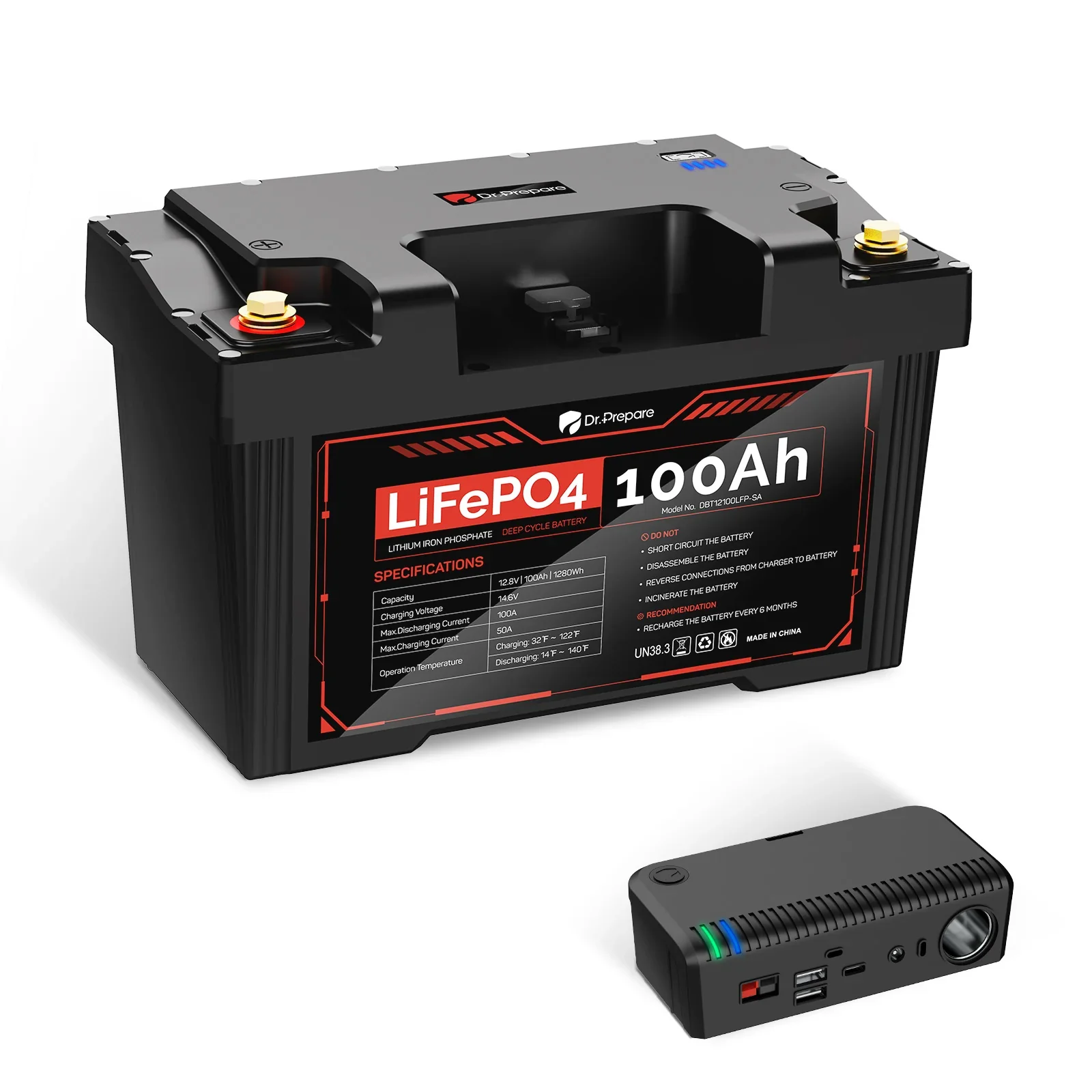 Description Specification Downloads FAQ Dr.Prepare 12V 100Ah LiFePO4 Battery, 10 Year Lifetime Lithium Battery, Low & High Temp Protection, Group 31, IP65, for RVs, Trolling Motors, Boats, Trailers, Home Backup Power Featuring a 10-year product support and lifespan, the Dr.Prepare 12V 100Ah LiFePO4 battery is a reliable power solution for a wide range of applications — including RVs, trailers, trolling motors, boats, off-grid cabins, and emergency backup during power outages. Built with Grade A cells and an upgraded Battery Management System (BMS) featuring low and high-temperature cut-off protection, this lithium battery delivers safe, consistent performance. Description 【 10-Year Lifespan & Built-in BMS 】 Our Dr.Prepare 100Ah LiFePO4 battery offers a 10-year product support and lifespan. The advanced built-in BMS system provides 20+ layers of protection — including low- and high-temperature cut-off — to protect the battery during charging and discharging, even under extreme conditions. Plus, all internal battery cells are UL-tested and certified to ensure maximum safety and reliability. 【 Upgrade to Dr.Prepare LiFePO4 Batteries 】 Dr.Prepare lithium batteries outperform traditional lead-acid batteries with a longer lifespan of up to 10 years, compared to just 1–3 years for most SLA options. Weighing only 22 lbs, this 12V LiFePO4 battery is lighter and delivers more consistent power than standard SLA batteries. Plus, it features an integrated BMS for enhanced safety — a level of protection SLA batteries simply don’t offer. 【 Series & Parallel Connections for Powerful Backup Power 】 Dr.Prepare 12V 100Ah lithium battery supports both series and parallel configurations. Easily build a 24V, 36V, or 48V battery bank with series wiring, or expand your capacity to 12V 200Ah, 300Ah, or 400Ah through parallel connections. For larger setups, you can link up to 16 batteries in series and parallel to create a powerful 20.48 kWh home backup system—ideal for power outages or hurricane season. 【 Trolling Motor, Solar RV, Home Backup 】 When using the battery with a trolling motor, we highly recommend installing a 60A–100A circuit breaker between the battery and your device to prevent overdischarging. These LiFePO4 batteries are also perfect for RV solar setups, off-grid camping, and home backup power during outages or hurricane season. 【 Charging & Discharging Tips 】 The optimal charging current is 20A (max 50A). For safe and efficient charging, use a compatible AC-to-DC LiFePO4 battery charger or a solar panel system with a charge controller. The max continuous discharging current is 100A. After a full discharge at 100A, avoid immediate recharging at 50A, as it may trigger the high-temperature charging protection. 【 Important Reminders 】 1. Ensure the battery terminals are securely fastened. Loose terminals can lead to heat accumulation and potential battery damage. 2. After a full discharge at a continuous 100A, avoid immediate recharging at 50A, as this may trigger high-temperature charging protection. 3. Optimal charging involves a 20A current for our lithium battery. While the maximum charging current stands at 50A, exceeding this limit can result in a shortened battery lifespan. Dr. Prepare batteries will be shipped from California, USA. We provide 10-year battery warranty and lifetime technical support. If you have any questions during usage, please feel free to contact us . Key Features 10-Year Lifespan 20+ Protections Low & High Temp Cut-Off Series & Parallel Emergency Backup Power Package Includes 1 x 12V 100Ah Lithium Iron Phosphate (LiFePO4) Battery with Handheld Strap 1 x M8 Bolts (A Pair) Specifications 100Ah LiFePO4 Lithium Deep Cycle Battery (S48) - Connect In Series Technical Specifications Model DBT12100LFP-S48-G7-US Nominal Voltage 12.8 V Energy 1,280 Wh Rated Capacity (0.2C) 100Ah Cycle Life (0.2C, 25±5℃) 3,000 Cycles at 80% DOD Maximum Continuous Discharge Current 100A Maximum Charge Current Optimal: 20A; Maximum: 50A Max. Charging Voltage 14.6V Discharge Cut-off Voltage Lower than 11.1V Self Discharge Rate 2% ~ 3% per month at 25℃ / 77℉ Over-Discharge Recovery Voltage 12.6V Charging Temperature Range 0℃~45℃ / 32℉~113℉ Discharging Temperature Range -10℃~60℃ / 14℉~140℉ Low Temperature Protection Charging: -5℃~+5℃ / 23℉~41℉ Discharging: -25℃ ~ -15℃ / -13℉~5℉ High Temperature Protection Charging: 60℃ ~ 70℃ / 140℉~158℉ Discharging: 70℃ ~ 80℃ / 158℉~176℉ Storage Temperature Range -20℃~45℃ / -4℉~113℉ (Store for 1-3 months) -20℃~20℃ / -4℉~68℉ (Store for 1 year) Recommended Operating Temperature 20℃ ~ 30℃ / 68℉~86℉ Terminal Bolt Size Tailor-made M8 Internal Resistance ≤10mΩ Weight 10 kg / 22 lbs Dimension 332 x 220 x 172 mm / 13.07 x 8.66 x 6.77 in (L x H x W) Compatible with the Group 31 battery case Download Why Isn’t the LED Display Accurate? If the LED display isn’t showing the correct readings, you can try calibrating it by following these steps: 1. Discharge the battery completely to 0%. 2. Use a compatible LiFePO4 battery charger or solar charge controller to fully charge the battery. If the issue persists, please contact us at [email protected] for further assistance. What are the charging voltage and charging current for this battery? The max. charging voltage is 14.6V and the max. charging current is 50A. For optimal charging performance, we highly recommend adjusting the voltage to 14.2V-14.6V and using a 20A charger. Does this 12V 100Ah battery offer low-temperature protection? Yes, it does. When the temp reaches -5℃~5℃, this lithium battery will stop being charged, and when the temp reaches -25℃~15℃, the battery will stop discharging. Ideal for harsh and rugged environments. It also has high temperature protection. Does this battery have low voltage cut-off protection? Yes, it does. When the discharge voltage is lower than 11.1V, the battery will