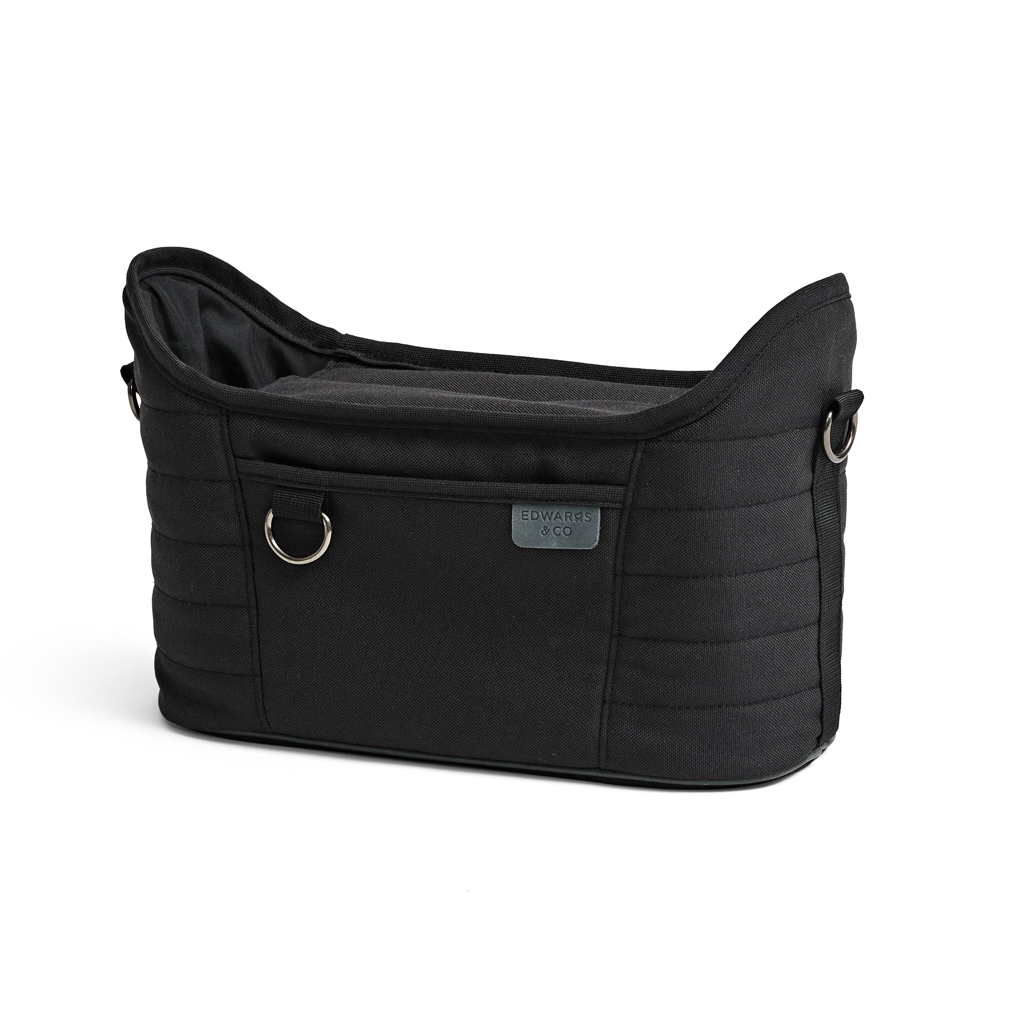 Our Stroller Organiser is a pram caddy that attaches to the handle of your Edwards & Co Olive, Oscar or Otto stroller with quick release tabs for easy removal. Featuring two insulated side pockets for bottles and water, zipped pockets for keys and wallet, and interior sections for everything else you need at your fingertips. You can reach into the Stroller Organiser without fussing with zips or buckles, and the self closing lid keeps everything secured safely.