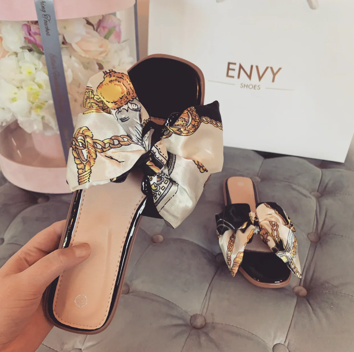 DETAILS A summer essential for daytime drinks or heading to the shops! Featuring a black slider with gold chain print scarf bow detailing. The Dolce Slides are perfect for summer and go with everything! Also available in other colours Please note: The print on the scarf may vary slightly from the image shown due to the nature of the fabric and differences in manufacturing.