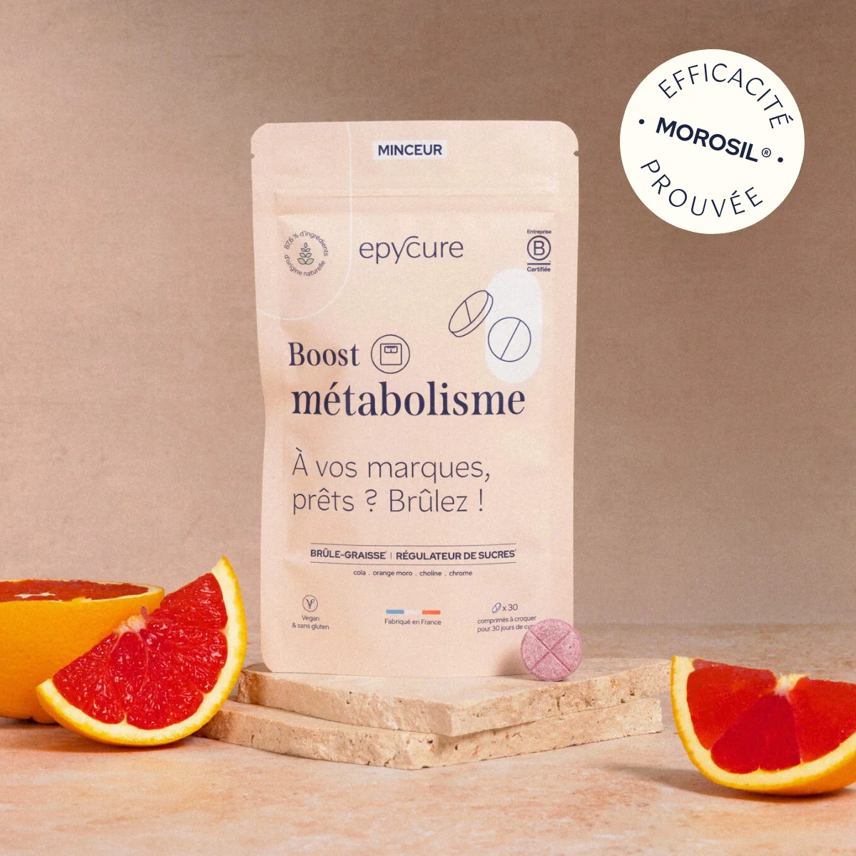 Imaginez-vous retrouver confiance en vous, prendre plaisir à manger équilibré et bouger votre corps pour prendre soin de votre santé, pas pour compenser vos écarts. Le Boost métabolisme a été spécialement formulé avec du Morosil® pour vous accompagner dans votre remise en forme en relançant votre métabolisme ralenti à cause des régimes restrictifs, en déstockant les graisses accumulées et en limitant les fringales pour une perte de poids saine et durable. Les résultats des études cliniques* parlent d’eux-mêmes : + Perte moyenne de 3 kg + Diminution de 7 cm de tour de taille + Diminution de 6 cm de tour de cuisse ______ Morosil® est une marque déposée de Bionap srl. *Efficacité prouvée dans 2 études cliniques menées en double aveugle avec placebo sur 60 volontaires (IMC compris entre 25 et 35 kg/m²) pendant 12 semaines, à la dose de 400 mg par jour.”
