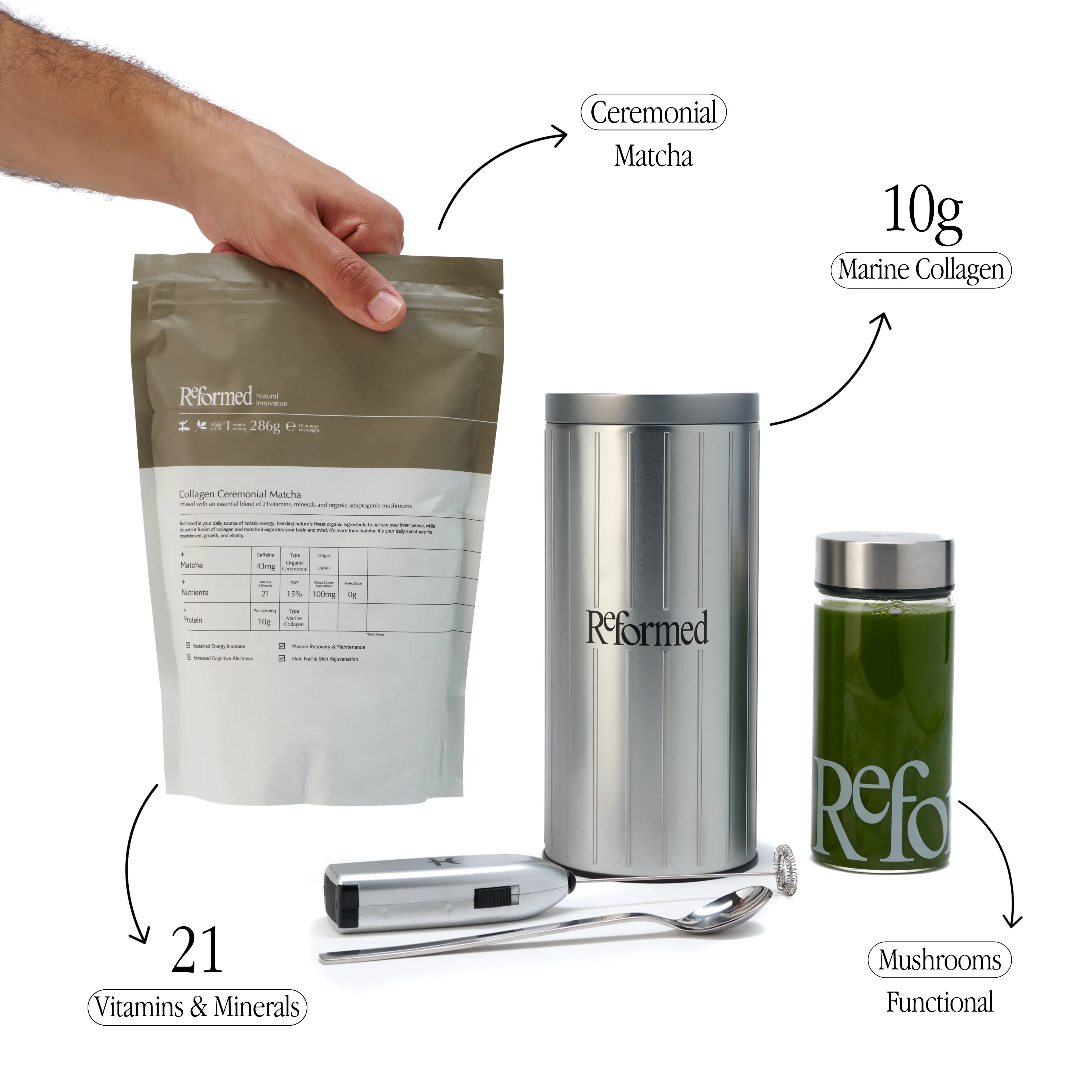 Reformed combines pure Ceremonial-Grade Matcha with the highest-grade Collagen peptides & adaptogens. It supports skin & hair rejuvenation, helps to refine your silhouette and promotes a calm & focused mind.
