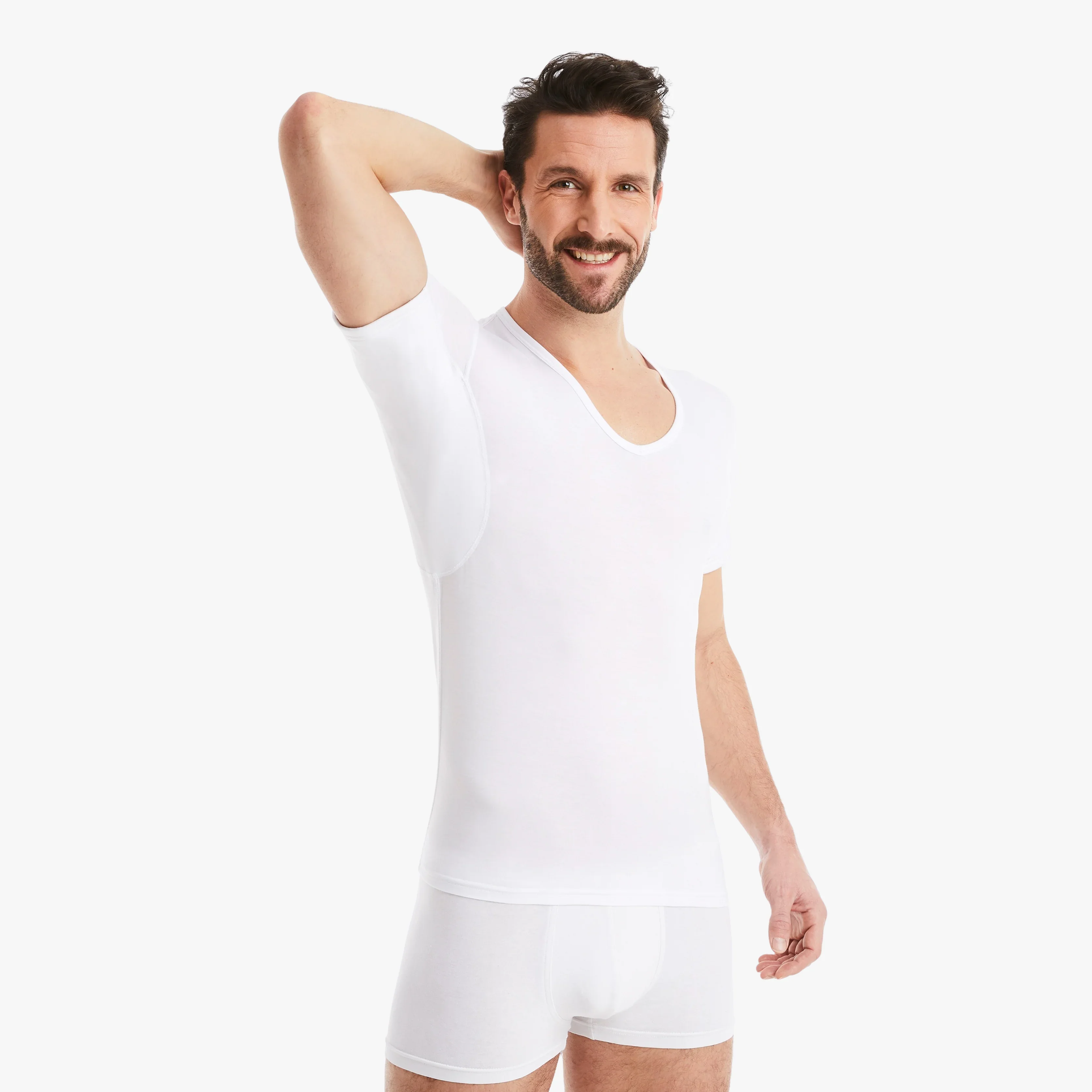 Unser Anti-Schweiß Shirt mit V-Ausschnitt ist dein idealer Begleiter für einen schweißfreien Alltag. Es bietet nicht nur 100% Schutz vor Schweißflecken unter den Achseln, sondern bleibt auch unter deiner Kleidung unsichtbar und komfortabel. 100% Schutz vor Schweißflecken unter den Achseln: Innovative Einlagen unter den Achseln, die effektiv Schweißflecken verhindern und dabei kaum spürbar sind. Antibakteriell mit Silvadur™: Schützt vor unangenehmen Gerüchen und hält dich den ganzen Tag frisch. Hochwertiges Modal: Bietet überlegenen Tragekomfort und fühlt sich an wie eine zweite Haut. Unsichtbar unter Kleidung: Das Shirt zeichnet sich nicht ab und rutscht dank des extra langen Rückens nicht aus der Hose. Langlebig und pflegeleicht: Behält Form und Frische auch nach wiederholtem Waschen.