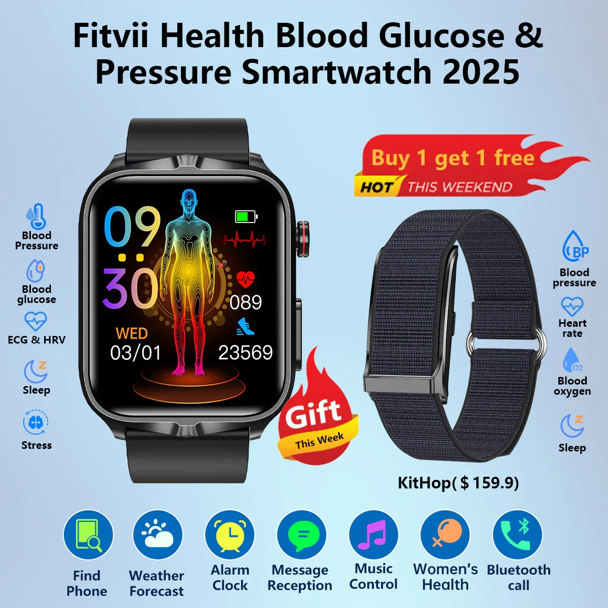 2026 Upgrade Fitvii® GT5 PRO MAX Health & Fitness Smartwatch with HR+BP+BG+ECG(EKG)+SPO2+TEMP+SOS+ Sleep+Blood Fat Monitoring + Straps Gift🎁 Your health doesn’t wait. Neither should you. From blood pressure and blood sugar tracking to SOS safety alerts and Bluetooth calling, it gives you or your family medical-grade insights straight from your wrist—no pressure, no needles, no guesswork. 🌟 Why Thousands Trust GT5 PRO MAX ✅ Blood Pressure Monitoring Stay ahead of hypertension with real-time tracking & easy-to-read trends. ✅ Non-Invasive Blood Glucose No needles, no strips. Just instant insights to manage diet and lifestyle. ✅ ECG + Heart Rate Alerts Catch irregular rhythms or stress changes before they become problems. ✅ SpO₂ + Advanced Sleep Tracking See how well you breathe and recover at night. Wake up truly informed. ✅ SOS One-Tap Call + Flashlight Safety for seniors and peace of mind for families — help is always one tap away. ✅ AI-Powered Health Assistant Smart alerts, proactive tips, and daily motivation to help you live healthier. 💎 All-in-One Health & Lifestyle Features Supports iOS, Android, iPad & 13+ Languages Your Ultimate Health Companion! All Features: ✅Blood Pressure ✅Blood Oxygen ✅Blood Glucose ✅Female health ✅Heart Rate ✅Heart Rate Alarm ✅Electrocardiogram (EKG) ✅HRV ✅Body Temperature ✅Uric Acid ✅Blood Components ✅Body Composition ✅120+ Sports Modes ✅Sleep Monitoring ✅Bluetooth Calling ✅Message Push ✅Message Reminders ✅Weather ✅Stress test ✅SOS Emergency ✅IP68 Waterproof ✅Breathing training ✅Sedentary Reminder ✅Wrist Flip Screen ✅Voice Assistant ✅Mini Games ✅Stopwatch ✅Alarm ✅Step Counter ✅Calorie Tracker ✅Alipay ✅Medication reminder ✅Calculator ✅Remote Camera ✅Music Control ✅Reading reminder ✅Supports all iOS , Android and iPad devices ✅ Supported 13 languages: English, Chinese, Traditional Chinese, Japanese, Korean, German, Russian, Spanish, Italian, French, Portuguese, Swedish, Turkish, etc. Packing list 1* GT5 Pro Max Watch 1* GT5 Pro Max Changer 1* GT5 Pro Max User Guide 2* GT5 Pro Max Straps 🎁 Perfect for Every Moment 👴 For Aging Parents — Real-time care even when you’re miles away 🏃 For Yourself — Stay in tune with your body 🎁 For Loved Ones — A meaningful gift that shows you care 🌟💝Give him or you a gift to mark this special moment. Check out now for 7-day delivery💝🌟 🔥 Exclusive Online Only — Available at the Official Fitvii Store As the proudest flagship of the GT series, GT5 Pro Max delivers higher blood pressure accuracy than any other watch in its class. ✅ 1-Year Warranty Included ✅ 7-Day Fast Delivery ✨ Don’t wait — your health (or your loved one’s health) is priceless. 👇Add to Cart Now & Give the Gift of Health👇 Christmas sale: 20% off, ships from the US. Original price after the holidays: $179.90 🔥 Buy Fitvii GT5 PRO MAX Gift Now Please note: Fitvii GT5 PRO MAX is currently only sold on the Fitvii website (warranty service is provided). 6 Frequently Asked Questions Is it accurate enough to trust? Fitvii uses industrial-grade sensors to track key health indicators such as heart rate, blood oxygen saturation, blood glucose, and blood pressure. While it is not a medical device, it can provide reliable trend data and alerts to help you proactively prevent potential health risks. Note: Blood pressure and blood glucose data require calibration before use. After purchasing the product, we will send you a video tutorial on data calibration via email. Some customers and bloggers have reported inaccurate data, often due to neglecting this calibration step. Please pay close attention to this. Do I need a subscription or pay extra after purchase? No subscriptions. No hidden costs. The FITVII app is completely free to use — forever. Once you buy the watch, everything you need is included. How is this different from cheaper fitness trackers? Most basic trackers have no certification and only have basic functions such as heart rate, blood oxygen, steps, sleep, etc. FITVII can track the indicators that really matter: your heart rate, blood oxygen level, sleep stage, blood lipids, MET, stress test, blood composition, blood sugar and blood pressure - all included in one device at no extra cost. In addition to these, we have received tens of thousands of customer reviews, repurchases and recommendations, which is more cost-effective than big-name watches. Is this suitable for seniors or people with health concerns? Yes. FITVII is designed to be simple, comfortable, and easy to read — especially helpful for anyone monitoring blood pressure, blood sugar, sleep quality, or heart rhythm regularly. Many of our customers are 40+. In addition, this product is also suitable for young people. Is FITVII worth the $179.9 price? Of course! For less than the cost of a physical examination, you can understand your heart, sleep, blood pressure and other health information every day, without paying monthly fees. It is not just a smartwatch, but also long-term health support on your wrist. The product has a one-year warranty, which means you only need to spend $0.49 or even less every day to improve your lifestyle. What if I don't like it? Please rest assured that your purchase is covered by a 1-year warranty and a 30-day return policy. The return period starts from the date you receive the goods. Where are the products shipped from? Fitvii has warehouses in both the United States and China. Generally, orders for customers in the United States are shipped from the US warehouse, while orders for customers outside the US are shipped from China. This saves customers on import taxes and duties. Is there customer support if I need help? Yes, Fitvii support team is available 7/24 hours via chat and email. We’re here to help you get the most out of your experience. Detail Upgrade Newest FITVII Health and Fitness Tracker 2025 innova