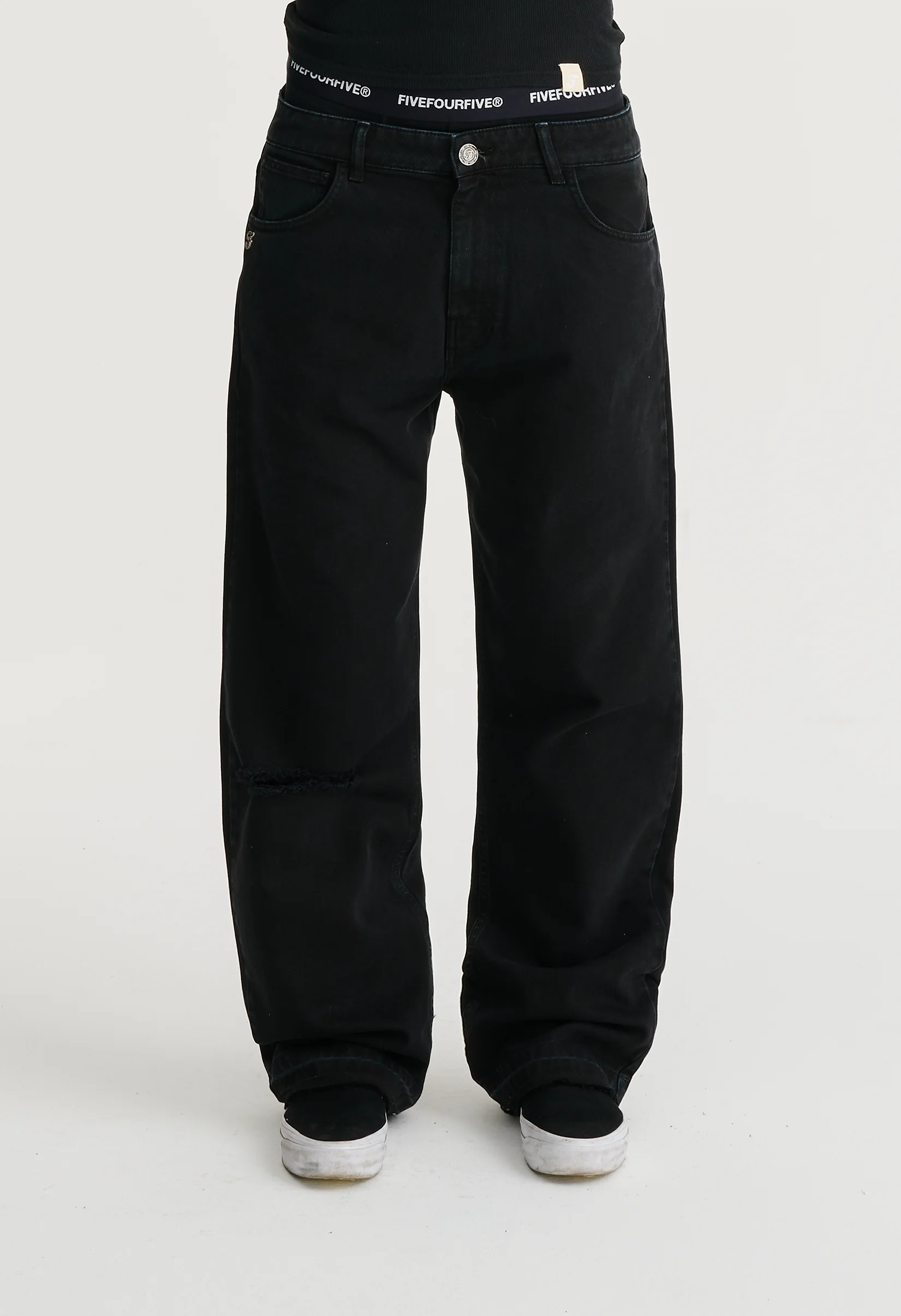 • Heavy 14oz cotton denim. • Five pockets. • Garment dyed and stone washed. • "F" metal rivet on the front pocket. • Embroidery on the left calf. • Wide fit. • Entirely designed and crafted in Italy.