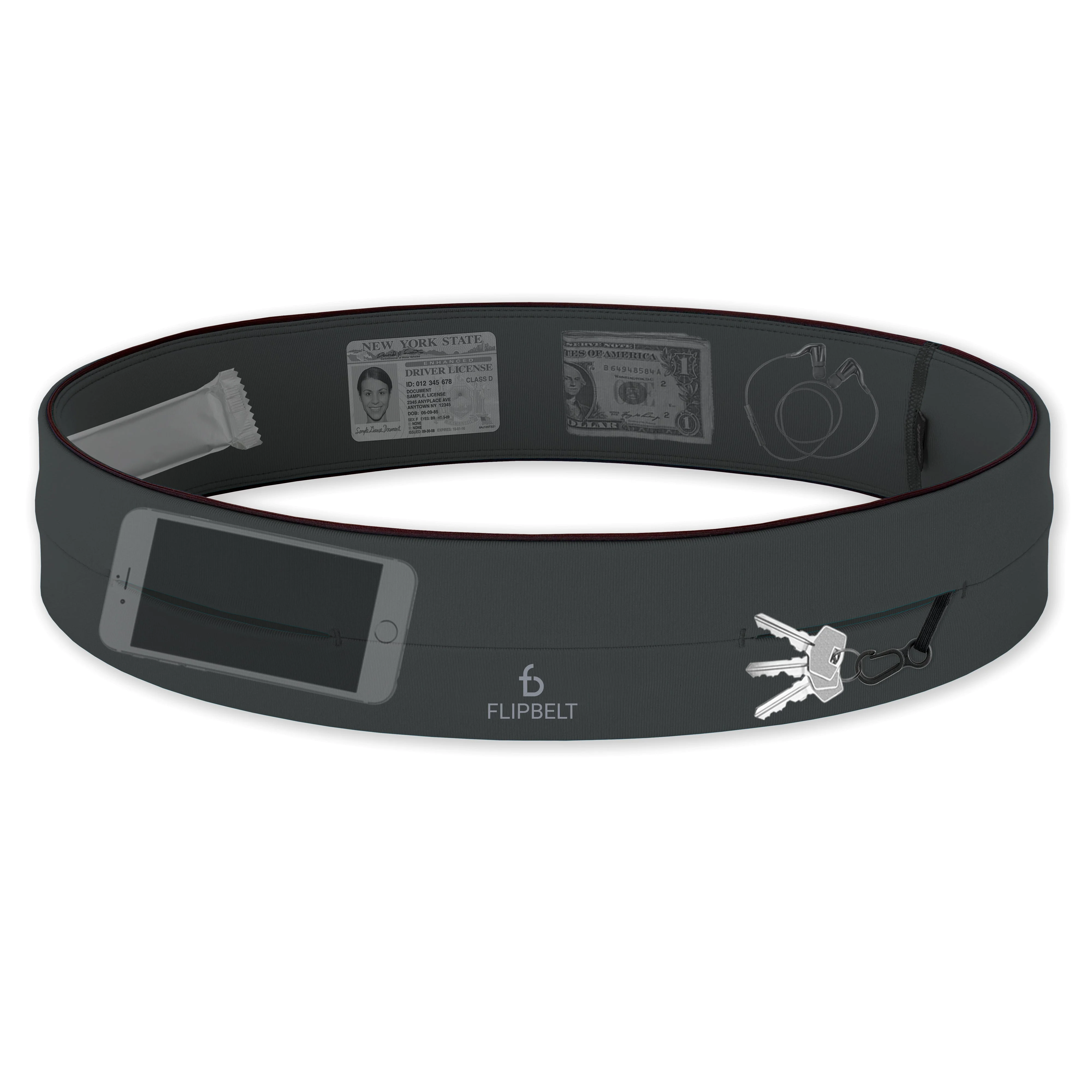 Fitness Belt for Phone & Keys The FlipBelt classic running belt is a comfortable exercise waist belt alternative to running armbands that don't fit all your things and bulky running pouches that bounce as you move. The FlipBelt waist band for running is specifically designed to sit flat and securely on your hips without bouncing or riding up. With no buckles to pinch or cause uncomfortable chafing, simply pull FlipBelt Classic running belt on like a pair of pants, place over or under clothes, and easily slide in your stuff through the multiple openings around the exercise belt. The sleek, tubular design of the FlipBelt Classic running belt allows you to easily, comfortably and securely carry everything you need while running, hiking, biking, working out at the gym, traveling and more. This exercise belt features moisture-wicking fabric that easily stretches to fit large phones like the iPhone XR and Samsung Notes ( Phone Compatibility List ) while also giving you plenty of room to store keys, cards, IDs, water bottles , and small medical devices. Turning the waist pouch for runners over closes all openings and further secures your items in place. For extra security, check out our FlipBelt Zipper ! Features: 92% Micropoly 8% Lycra Weight: 3.8oz (size medium) Moisture wicking, quick drying and extra softness against your skin Internal key hook for added security Multiple pocket openings Quality reflective logo Machine wash and dry or hang dry FlipBelt is used for: Running and jogging Walking Hiking Biking Traveling Gym workouts Holding medical devices Concerts and amusement parks Dancing And much more!