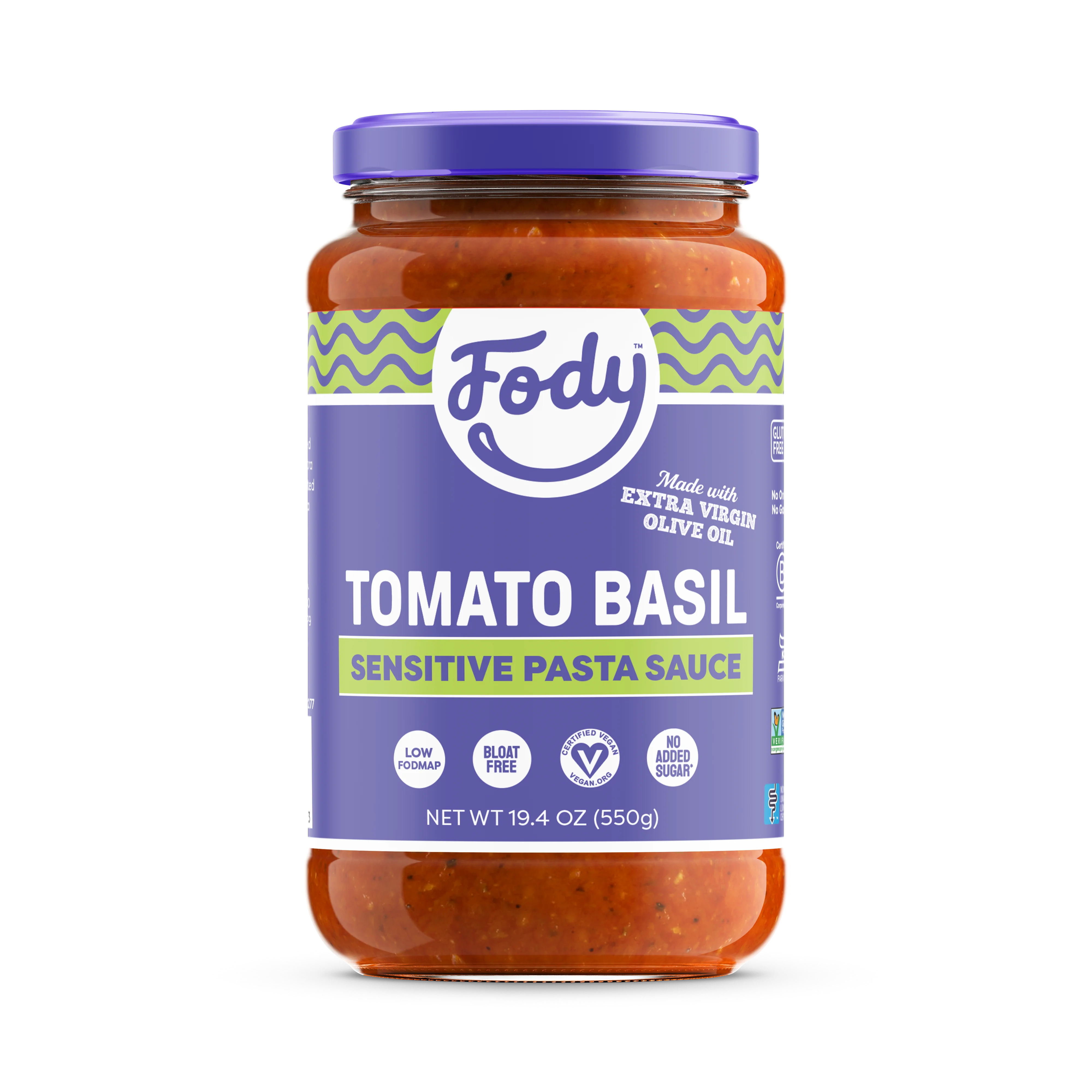 Add a burst of fresh, vibrant flavor to your meals with our Low FODMAP Tomato Basil Pasta Sauce — a wholesome, and IBS-friendly pasta sauce crafted with vine-ripened tomatoes, sweet basil, and rich extra virgin olive oil. Made with NO onion, NO garlic, gluten-free, and with NO added sugar, this IBS-friendly pasta sauce celebrates the beauty of fresh, delicious, and simple ingredients. Now certified kosher. For easy weeknights, this Low FODMAP Tomato Basil Pasta Sauce delivers bright basil-and-tomato flavor without onion or garlic, keeping prep simple. It also doubles as a quick, weeknight-friendly Low FODMAP pizza sauce when you want pizzeria vibes at home without the triggers. Perfect For: Tossing with pasta for a light, aromatic, and comforting meal. Using as a base for pizzas, zoodle dishes, or hearty soups. Drizzling over roasted veggies or adding to grain bowls for a zesty, fresh finish. Chef tip: For ideal coating, use ½–¾ cup of Sauce per 8 oz of pasta, then finish with 1–2 tsp EVOO off-heat for a restaurant-style gloss and aroma. Check out our fan favorite recipes using Low FODMAP Tomato Basil Pasta Sauce: Fody’s Lemon Herb Chicken with Tomato Basil Pasta Fody’s Tomato Basil Zoodle Spaghetti & Arugula Roasted Pepper Salad with Balsamic Dressing Fody’s Rustic Vegetable Soup with Tomato and Sausage These recipes show how a Tomato Basil Pasta Sauce can fit Low FODMAP meals without sacrificing authentic flavor. Low FODMAP, No onion, No garlic. Size: 19.4 oz (550 g) x3