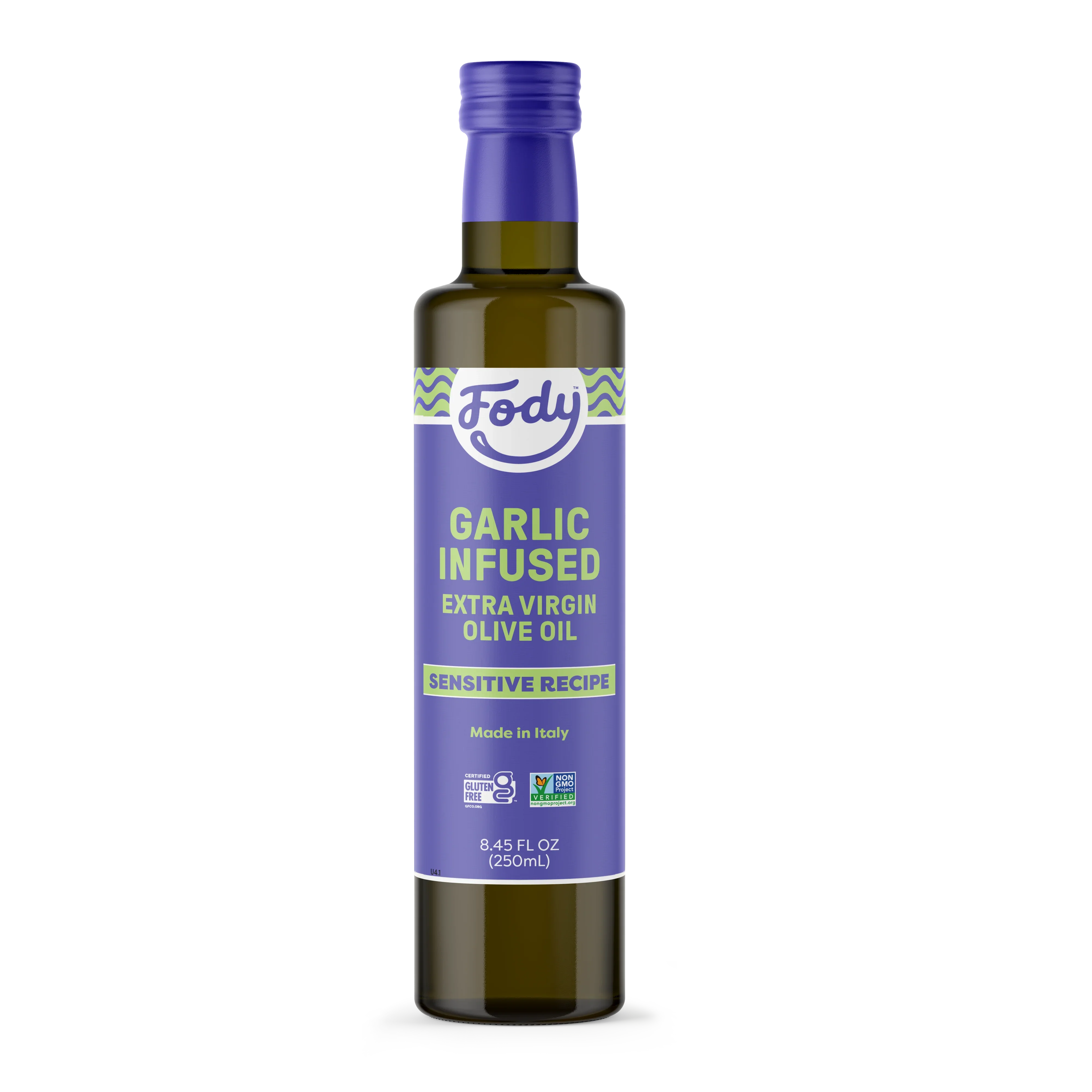Fody’s Low FODMAP Garlic-Infused Olive Oil is a premium, extra virgin IBS-friendly olive oil , crafted in Italy from cold-pressed olives and infused with natural garlic essence. It’s rich, aromatic, and designed for everyday use — whether you’re drizzling over vegetables, sautéing greens, or finishing pastas and proteins with bold flavor. This Low FODMAP oil delivers garlic taste without triggers while keeping meals light and digestible. This is not your average cooking oil — it’s a finishing oil that brings depth and savory character without triggers that cause discomfort. It’s gluten-free, made without onion or garlic solids, and crafted for anyone looking to enjoy garlic flavor the gut-friendly way. Among Low FODMAP Oils, it’s a versatile go-to and an ideal olive oil suitable for an IBS-friendly diet for weeknight meals and special meals alike. Perfect for: Drizzling over roasted potatoes, grilled veggies, or cooked grains Sautéing spinach, zucchini, or other tender vegetables Finishing pasta dishes or roasted meats with a rich garlic touch Mixing into dressings or dipping with sourdough bread Fan-Favorite Recipes Featuring This Low FODMAP Oil: Spicy Mussels and Pasta with Garlic Bread Italian Marinated Chicken Thighs with Crispy Potato Wedges Shrimp Skewers with Citrus Herb Rice Crafted in Italy and made without onion, garlic solids, or additives, this Low FODMAP oil brings big flavor — without the triggers. Low FODMAP. Gluten-Free. Extra Virgin. Size: 8.45 oz (250ml)