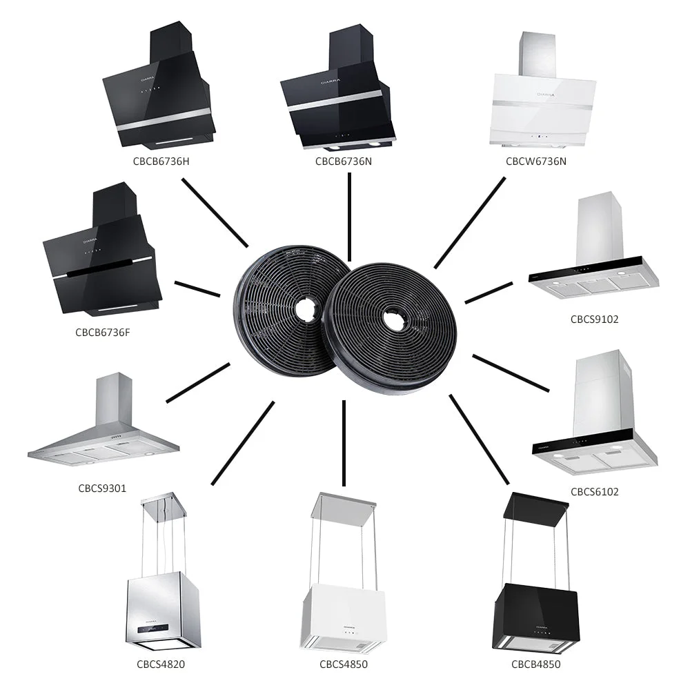 Modèle du filtre : CBCF003 Filtre à charbon Dimension: φ175mm Pourquoi avez-vous besoin de filtres à charbon ? Les filtres à charbon sont conçus pour absorber les odeurs de cuisson avant de recycler de l'air dans votre cuisine. Les filtres ne sont pas conçus pour absorber de grandes quantités d'eau ou de vapeur, mais pour purifier l'air telles que la fumée et les odeurs. Comment installer filtre à charbon ? Démonter d'abord le filtre à graisse pour monter le filtre à charbon actif. Appuyer sur le verrou et le tirer vers le bas. Brancher le filtre à charbon actif dans l'appareil et le tourner dans le sens horaire. Répéter la même étape dans l'autre côté. Monter le filtre à graisse. Pour garantir les meilleures performances de votre hotte, veuillez remplacer le filtre à charbon tous les 2 à 4 mois, selon la fréquence d'utilisation Convient pour le modèle de hotte : CBCB6736N-OW , CBCS6102-OW , CBCS9102-OW , CBCW6736N-OW , CBCS4850-OW , CBCB4850-OW , CBCB6736F-OW