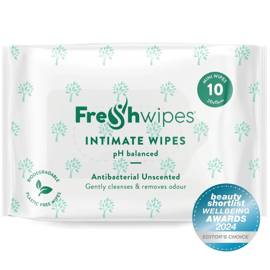 Welcome to FreshWipes Intimates, your ultimate solution for intimate hygiene. Our small, unscented wipes are specially designed for use in intimate areas and are gentle yet effective. At 20x15cm per wipe, each pack of FreshWipes Intimates comes with 10 wipes, making it easy to stay clean and fresh on-the-go. Our Intimates wipes are perfect for those looking for a convenient and discreet way to stay fresh during their menstrual cycle, or for everyday intimate hygiene. Our wipes are gentle on sensitive skin and are free from alcohol or fragrances, ensuring a gentle clean. Trust FreshWipes Intimates to keep you feeling clean and confident, no matter where your day takes you. Order your pack of FreshWipes Intimates today and experience the difference in intimate hygiene. Biodegradable: FreshWipes Intimates are made from viscose and are compostable, reducing your carbon footprint and helping to protect the environment. Unscented: Our wipes are free from harsh fragrances, making them gentle on sensitive skin and suitable for those with allergies or sensitivities. Compact Size: Measuring just 20x15cm and weighing only 137g per pack, our wipes are compact and portable, making them convenient for on-the-go use and discreet storage. Antibacterial: FreshWipes Intimates are gently antibacterial (contain Chlorhexidine), helping to protect against harmful bacteria and reducing the risk of infections and irritation. Non-Flushable: Our wipes are NOT flushable, please discard in the composter or bin. Benefits: Can be composted or binned (DO NOT FLUSH) Suitable for your sensitive skin in the intimate area Convenient for on-the-go use and discreet storage Protection against harmful bacteria and reducing risk of infections and irritation Remove the fear of odour when you are unable to wash your intimate areas Ingredients: AQUA, CHLORHEXIDINE DIGLUCONATE, DEHYDROACETIC ACID, GLYCERIN, BENZALKONIUM CHLORIDE, ALOE BARBADENSIS LEAF EXTRACT (ALOE VERA), TOCOPHEROL, PROPYLENE GLYCOL, LAURYL GLUCOSIDE, CHAMOMILLA RECUTITA FLOWER EXTRACT (MATRICARIA), ALLANTOIN, CITRIC ACID