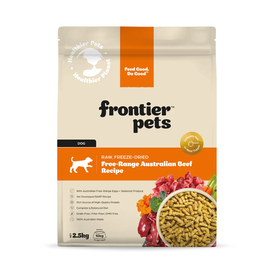 RAW, FREEZE-DRIED DOG FOOD Meet the better, more sustainable dog food. Frontier Pets’ freeze-dried beef dog food is part of the movement to end factory farming, supporting Aussie farmers who practice sustainable agriculture. Most Importantly, your dog will benefit... it will be healthier, have more vitality and will be more likely to maintain a healthy weight.