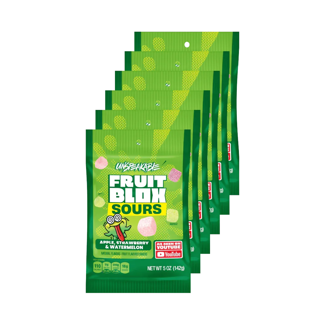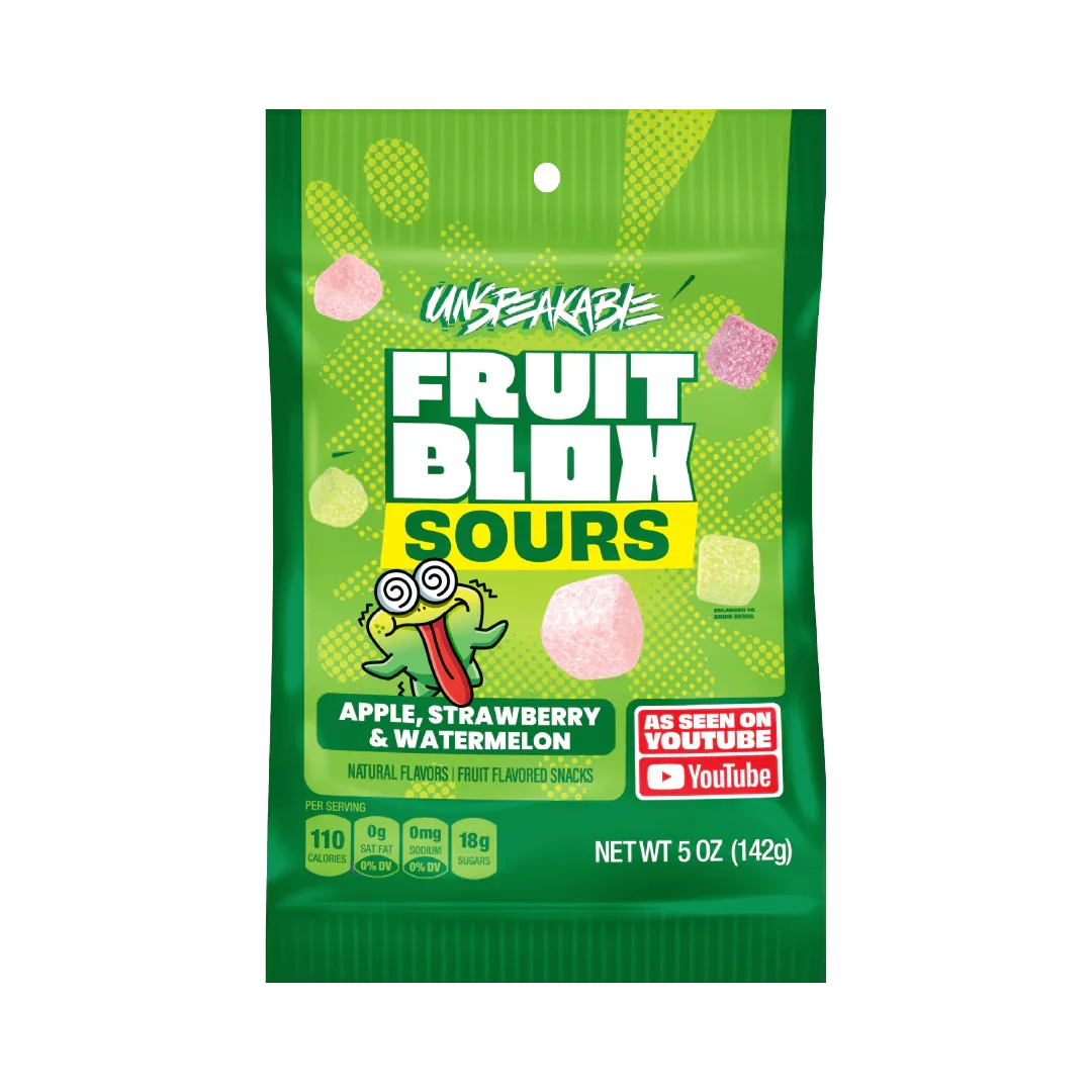 Now introducing...Apple, Strawberry & Watermelon FruitBlox Sours, from one of the most influential YouTubers kids adore, Unspeakable! Parents know better than anyone that kids today can't get enough of what to watch next on YouTube. That's why we know they're going to LOVE finding the most exciting fruit snacks on shelf in their lunch box. Or on-the-go from school to soccer. Or after dance class. Or while playing video games with friends. Or....well, really, the list goes on for a kid's busy schedule. These great tasting fruit snacks are made with real fruit juice and no artificial flavors or colors, that's a win for moms, dads, & kids everywhere. Snack. Play. Power Up. Contains 22 Pouches of FruitBlox Sour Fruit Snacks Every pouch is 20g, perfect for on-the-go or in your kid’s lunchbox Made with Real Fruit Juice No Artificial Flavors or Colors Non-GMO As Seen on YouTube Vegan & Gluten Free