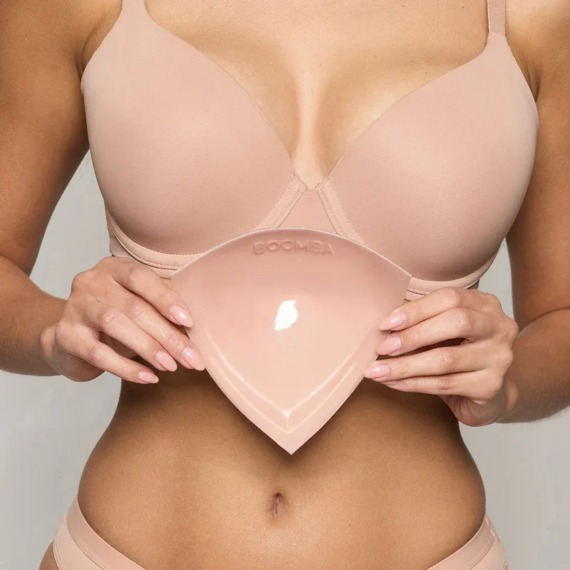 UK Customers: No taxes & import duties. BOOMBA's most padded insert style. The go-to for that wow factor. Instantly boost up to 2 cup sizes. Recommended for tops with structure in the chest area. For the perfect fit, we recommend choosing your true size. Only size down if you are in between sizes. Triangular-shaped, best for low v-cut tops Boosts up to 2 cup sizes Double-sided adhesive for extra security Sweat and water-resistant No sewing required and interchangeable between outfits Our inserts are not intended for individuals who have sensitive or thin skin, or women who are pregnant or breastfeeding Unlike a sticky bra that is supported by the adhesive, BOOMBA inserts are supported by the clothing and cannot stay up by themselves. It is crucial to wear them in tight, structured, and fitted tops. For the perfect fit, we recommend choosing your true size. Only size down if you are in between sizes. Have augmented breasts? Please check our FAQ section to see if they are suitable for you.