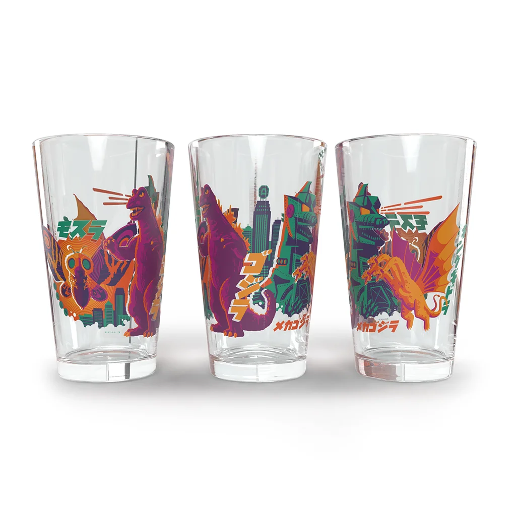 Drink up, Godzilla is coming. This limited-edition pint glass, with art by Tom Whalen, showcases Godzilla, Mothra, Mechagodzilla, and King Ghidorah in electrifying city-smashing scenes in vivid color. Perfect for movie lovers and kaiju fans alike, this pint won't be around for long. Pre-order now and own a piece of cinematic monster history. Details: 16 oz. glass Limited-edition Designed by Tom Whalen