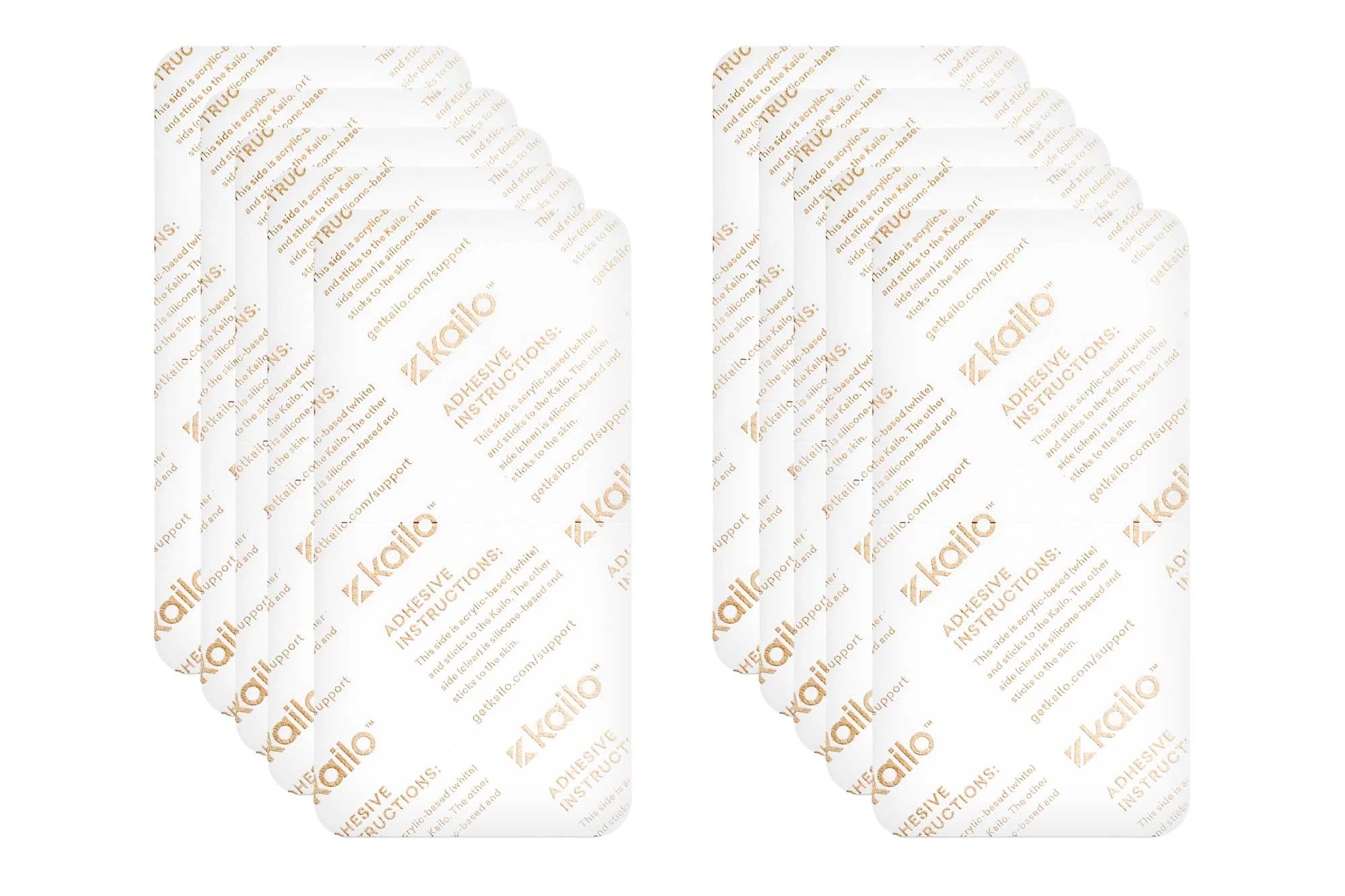 Includes 10 silicone adhesives. Soft on the skin and can re-stick multiple times. Each adhesive can last anywhere from 1 - 7 placements depending on location and skin type. We've found that a Kailo with our adhesive backing can be removed and reapplied to your skin multiple times before losing its stick. When the adhesive loses its stick, wash it gently with soap and water to renew its stickiness. If that doesn't work, simply peel the adhesive off and put on a new one. The adhesive backing is double-sided. One side, made of an acrylic-based adhesive is applied to the Kailo. The other side, made of a skin-friendly, silicon-based adhesive, should be applied to your skin. *A small percentage of customers have reported allergic reactions to our silicone -based adhesive Adhesives only, Kailo and Carry Case not included.